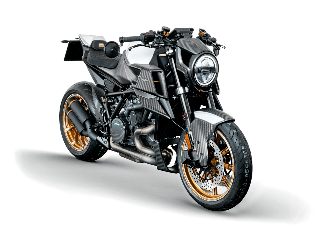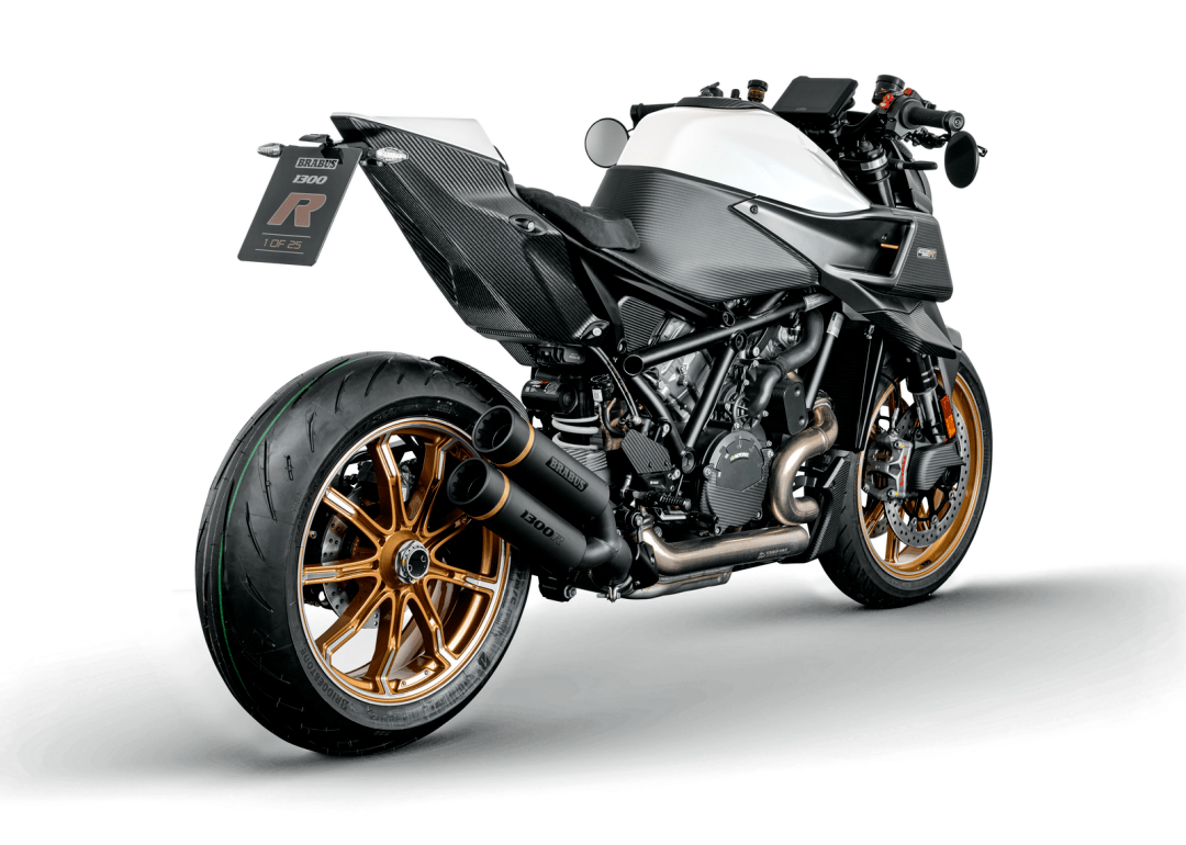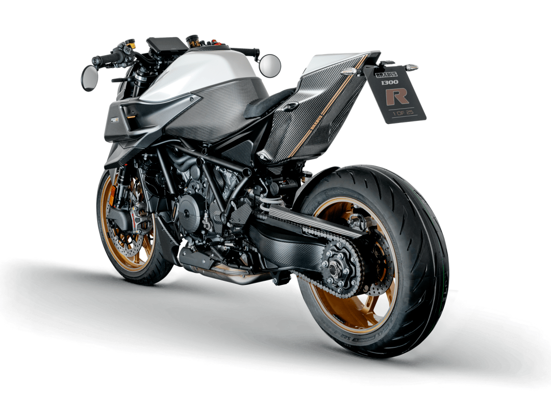 九月 27 日,Brabus 博速發(fā)布了新的 1300 R Masterpiece 杰作版。新車以 KTM 1290 Super Duke R Evo 為基礎修改而成,有瑪瑙黑(onyx Black)和鉆石白(Diamond White)兩個不同版本,車體部分組件以冷凍金(Frozen Gold)作為修飾,各限量生產(chǎn) 25 輛。