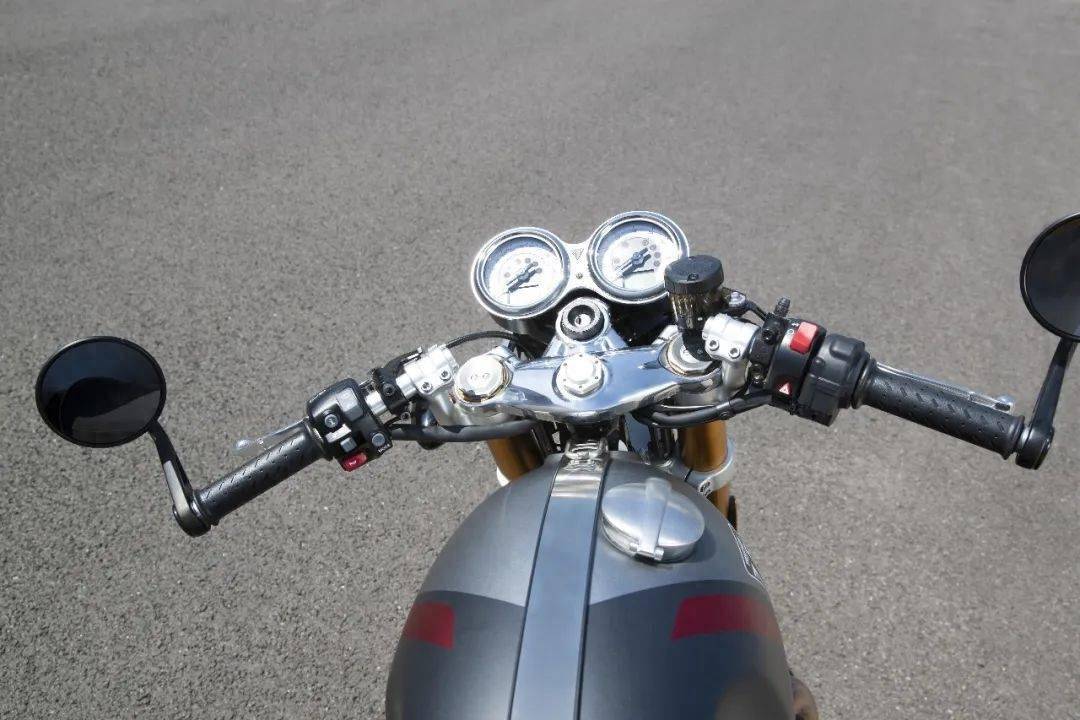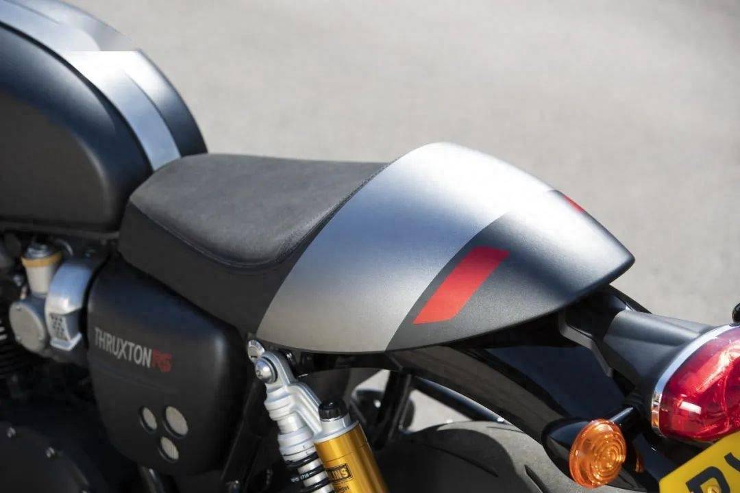 造型風格方面完全沒有顧慮。來自英倫風濫觴之地的Thruxton 1200 RS,不僅凸顯低矮的分離式車把、狹長油箱、單人坐墊等特點,而且在各個細節(jié)匠心獨運,烘托出濃郁的古典韻味。盡管并列雙缸采用了液冷散熱,但這顆動力心臟仍然繼承了大型散熱片,采用黑色噴涂,并在邊緣精細打磨,讓冷酷的黑色與金屬本色相互映襯。發(fā)動機的左右兩側(cè),分別引出一只修長的喇叭筒式消音器,與并列雙缸前后呼應,勾勒出上個世紀60年代的古典跑車造型。Thruxton 1200 RS的前后輪輞直徑都是17英寸,安裝的是鋼絲輻條,再匹配全新的高粘性輪胎,強化了古典運動味道。坐墊則是單座設計,尾部呈現(xiàn)迷你駝峰造型,高調(diào)宣告英倫風的鮮明身份!