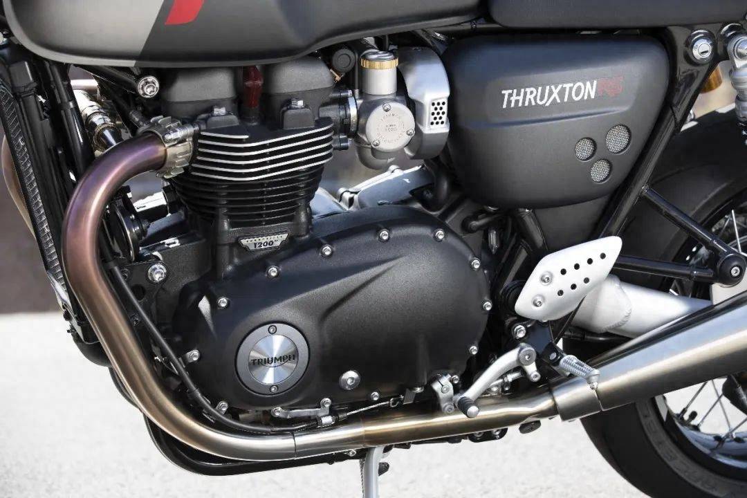 Thruxton 1200 RS貫徹了更徹底的古典跑車理念。首當其沖的就是動力裝置的改進,與上一代相比,Thruxton 1200 RS的動力心臟外表依然故我,搭載的是液冷、SOHC 8氣門的并列雙缸發(fā)動機,排量維持1200mL不變。但這只是表象,事實上,Thruxton 1200 RS的采用了更高壓縮比的活塞,優(yōu)化了進氣道和凸輪輪廓,配置了次級進氣系統(tǒng),此外曲軸、平衡軸、磁電機等都作了改進。因此,Thruxton 1200 RS的動力更強勁,最大功率提高到77kW(7500r/min);最大扭矩雖然維持不變,但是中低轉(zhuǎn)速扭矩更充裕,爆發(fā)最大扭矩的轉(zhuǎn)速提早了700r/min;動力響應更爽快,發(fā)動機內(nèi)部慣性質(zhì)量降低了20%;功率帶范圍更寬,轉(zhuǎn)速紅線增加了500r/min。簡而言之,Thruxton 1200 RS搭載的動力心臟更強勁、更興奮,全轉(zhuǎn)速范圍內(nèi)的表現(xiàn)都得到提升,為騎手提供更爽快的動力響應和更強的加速性能。