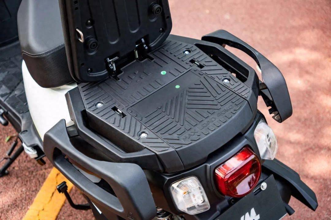 后座的儲(chǔ)物空間也是這款車的一大亮點(diǎn)??煞鄣暮笞梢栽趩稳蓑T行時(shí)當(dāng)作靠背使用,同時(shí)后座下方有一非常平整的置物空間可供使用,如果覺得空間不夠大,通過伸縮拉板還可以擴(kuò)大置物空間。這塊能承受40kg的置物空間可以用來放各種貨物,而且有了伸縮拉板,可以使貨物放置得更加穩(wěn)定,非常實(shí)用的設(shè)計(jì)。