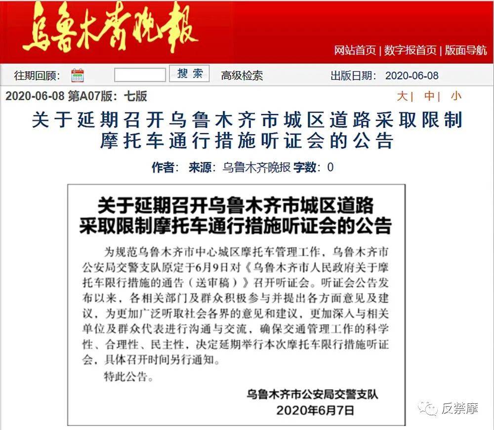 6月8日,《烏魯木齊晚報》刊登了烏魯木齊市公安局交警支隊于6月7日發(fā)布的“關(guān)于延期召開烏魯木齊市城區(qū)道路采取限制摩托車通行措施聽證會的公告”。