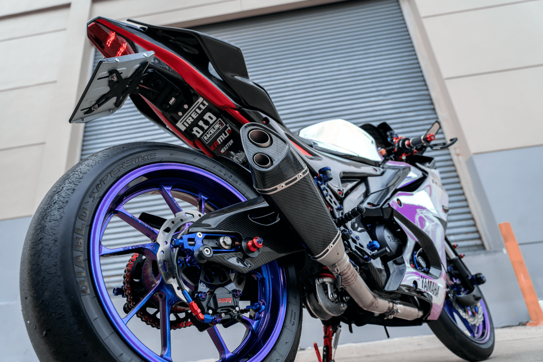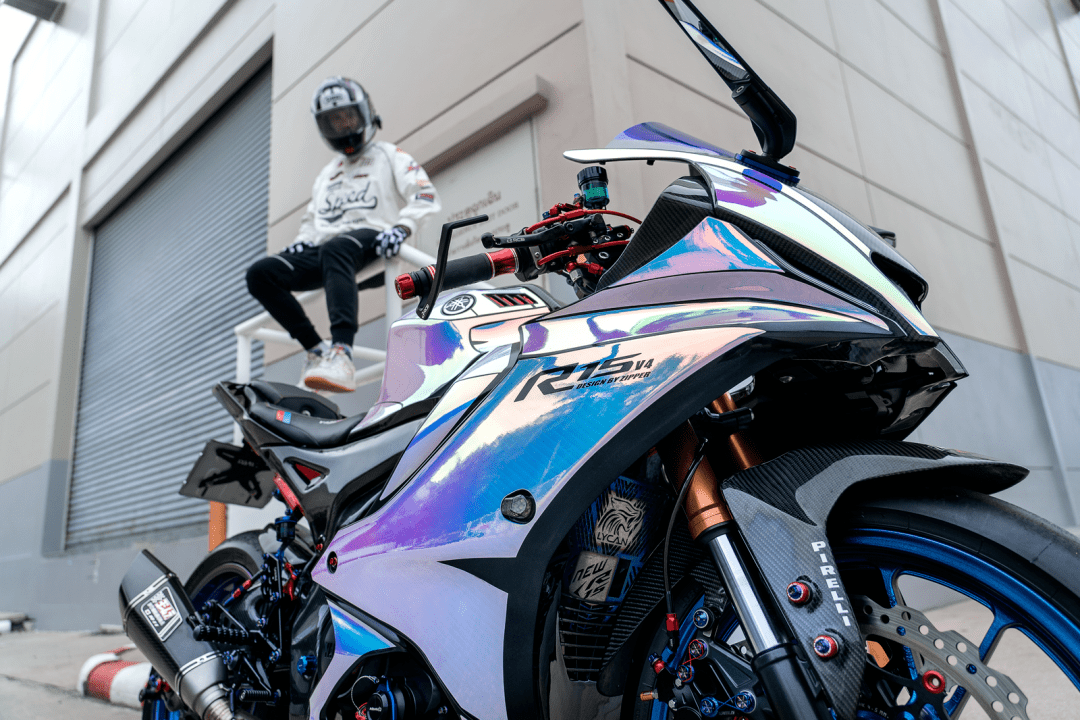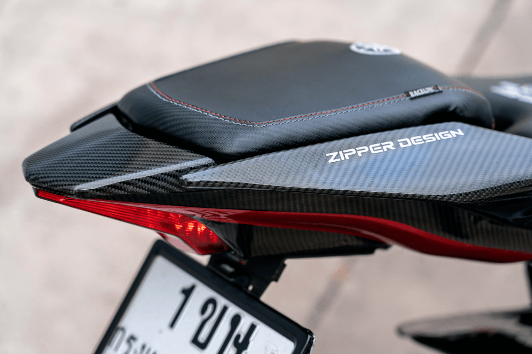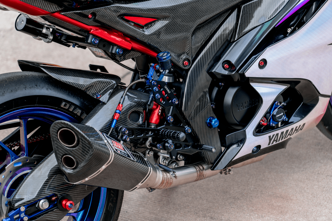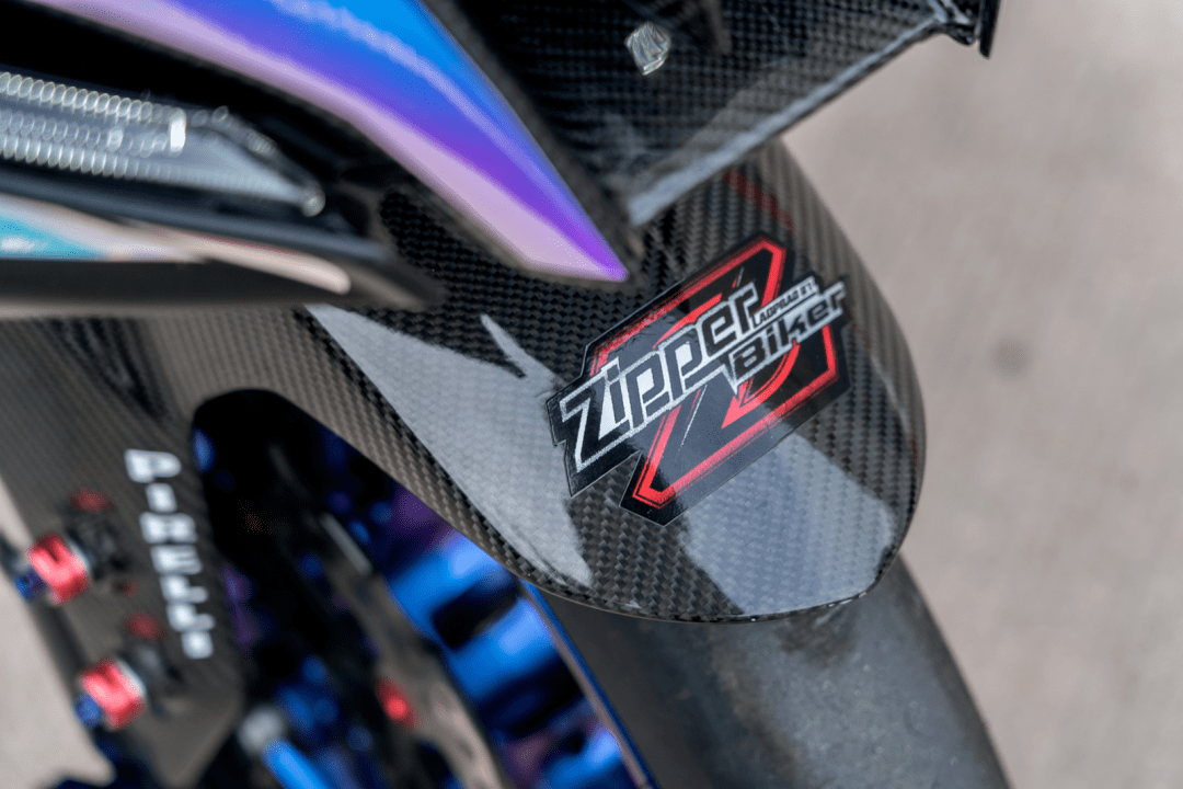 該作品采用了中國改裝品牌 Adelin 愛得利的前后剎車卡鉗,多處采用了東南亞改裝品牌 RCB 的產(chǎn)品,YSS 的后減震和方向阻尼器,Yoshimura 吉村的排氣系統(tǒng)等。而大量的碳纖維覆蓋件,以及電鍍風(fēng)格的貼花,是外部的重要亮點。