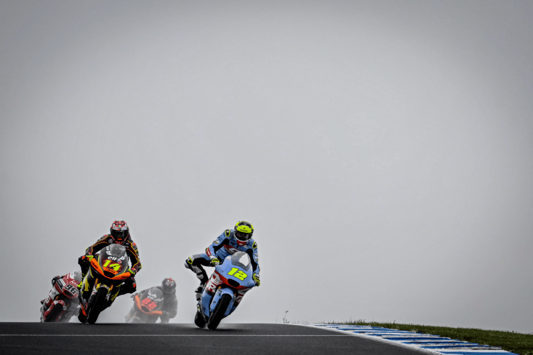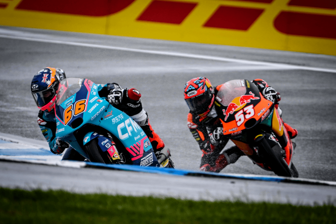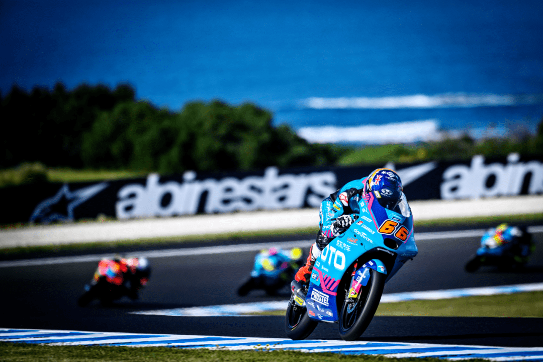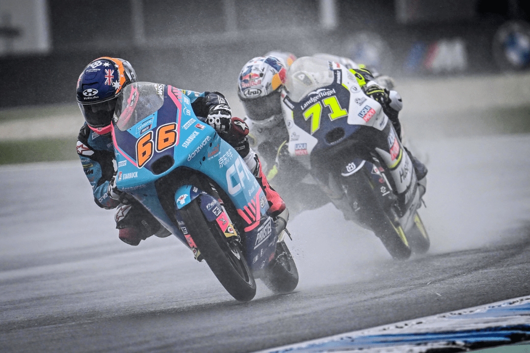 Moto3 級別,Q2 排位賽的時候,66 號車、主場出賽的凱爾索(Joel Kelso)就展現(xiàn)出良好的速度、拿到了第二。風(fēng)雨中進行的 21 圈比賽,大部分時間里、他都處于第一集團里與對手展開爭奪。最終凱爾索奪得了比賽第三名,拿到了自去年首次全季參加 Moto3 以來第一次登上頒獎臺的三甲位置。