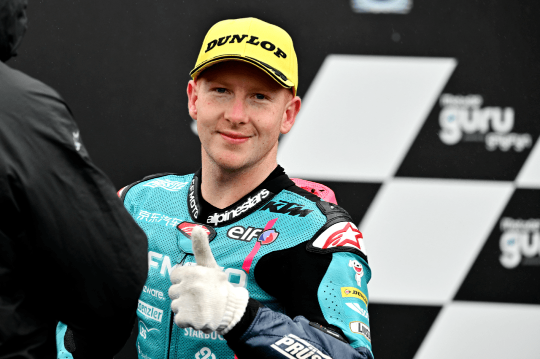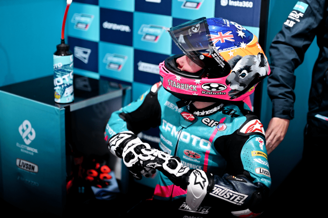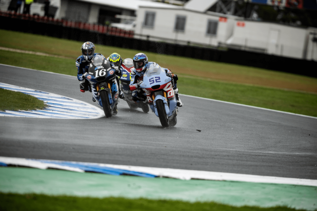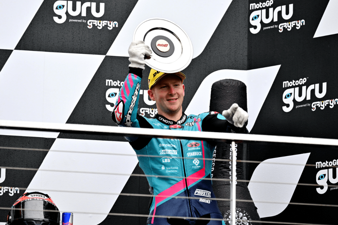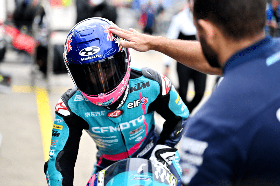 Moto3 級別,Q2 排位賽的時候,66 號車、主場出賽的凱爾索(Joel Kelso)就展現(xiàn)出良好的速度、拿到了第二。風(fēng)雨中進行的 21 圈比賽,大部分時間里、他都處于第一集團里與對手展開爭奪。最終凱爾索奪得了比賽第三名,拿到了自去年首次全季參加 Moto3 以來第一次登上頒獎臺的三甲位置。