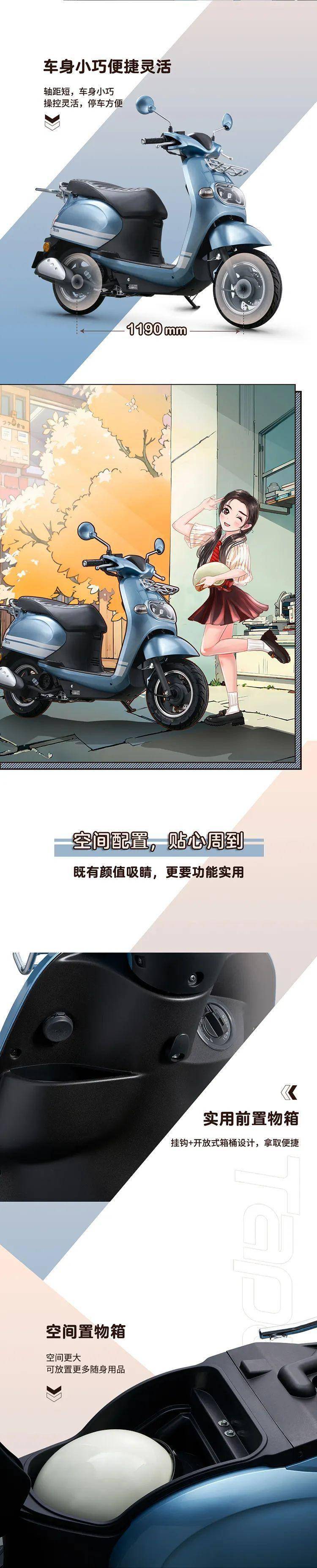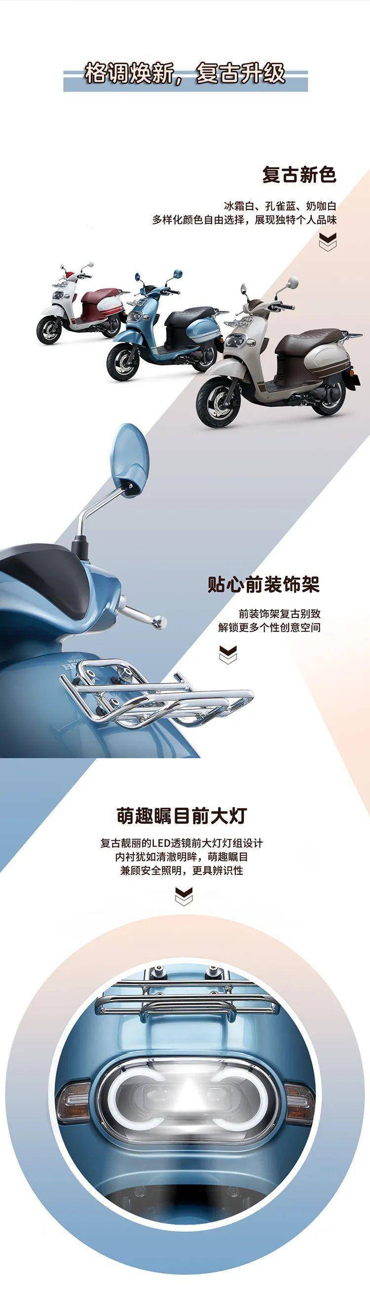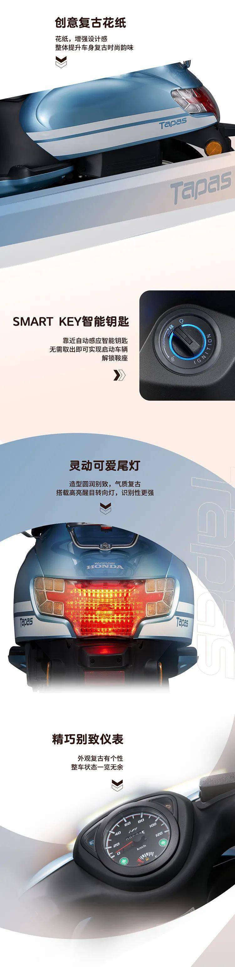 New Tapas冰霜白、奶咖白、孔雀藍(lán)的多樣化顏色可自由選擇,展現(xiàn)獨(dú)特個(gè)人品味;貼心前裝飾架造型復(fù)古別致,解鎖更多個(gè)性創(chuàng)意空間;萌趣矚目LED透鏡前大燈燈組設(shè)計(jì),內(nèi)襯猶如清澈明眸萌趣矚目,兼顧安全照明,更具辨識(shí)性;創(chuàng)意復(fù)古花紙?jiān)鰪?qiáng)設(shè)計(jì)感,整體提升車身復(fù)古時(shí)尚韻味;SMART KEY智能鑰匙,靠近自動(dòng)感應(yīng),無需取出即可實(shí)現(xiàn)啟動(dòng)車輛解鎖鞍座;靈動(dòng)可愛尾燈造型圓潤別致,氣質(zhì)復(fù)古,搭載高亮醒目轉(zhuǎn)向燈,識(shí)別性更強(qiáng);儀表精巧別致,外觀時(shí)尚有個(gè)性;獨(dú)特造型排氣管設(shè)計(jì)復(fù)古又可愛。整體讓New Tapas騎行時(shí)更加吸睛。