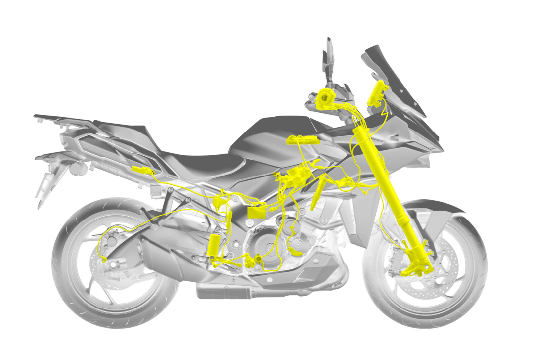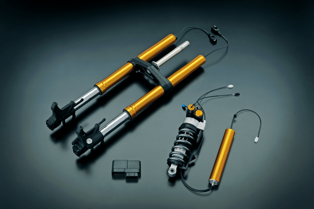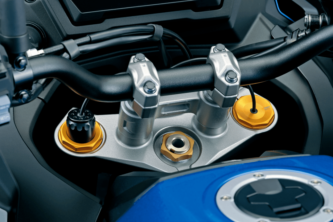 7、新的 GSX-S1000GX 是第一個配備了 SAES(Suzuki Advanced Electronic Suspension,Suzuki 先進(jìn)電子懸掛)電子懸掛系統(tǒng)的車型,懸掛系統(tǒng)的前后行程均為 150 mm(GT 版懸掛系統(tǒng)的行程為前 120 mm、后 130 mm)。該懸掛系統(tǒng)以 Showa(日立 Astemo)的 EERA 為基礎(chǔ),專為 GSX-S1000GX 而設(shè)計(jì),其基本工作原理是透過六軸 IMU 和車輪速度傳感器、前后懸掛內(nèi)所集成的高精度行程傳感器向 ECU 發(fā)送的信息,系統(tǒng)根據(jù)預(yù)設(shè)的當(dāng)前騎行條件,對懸掛系統(tǒng)作出自動調(diào)整,確定最佳阻尼、從而實(shí)現(xiàn)一個接近于理想的騎行質(zhì)量;