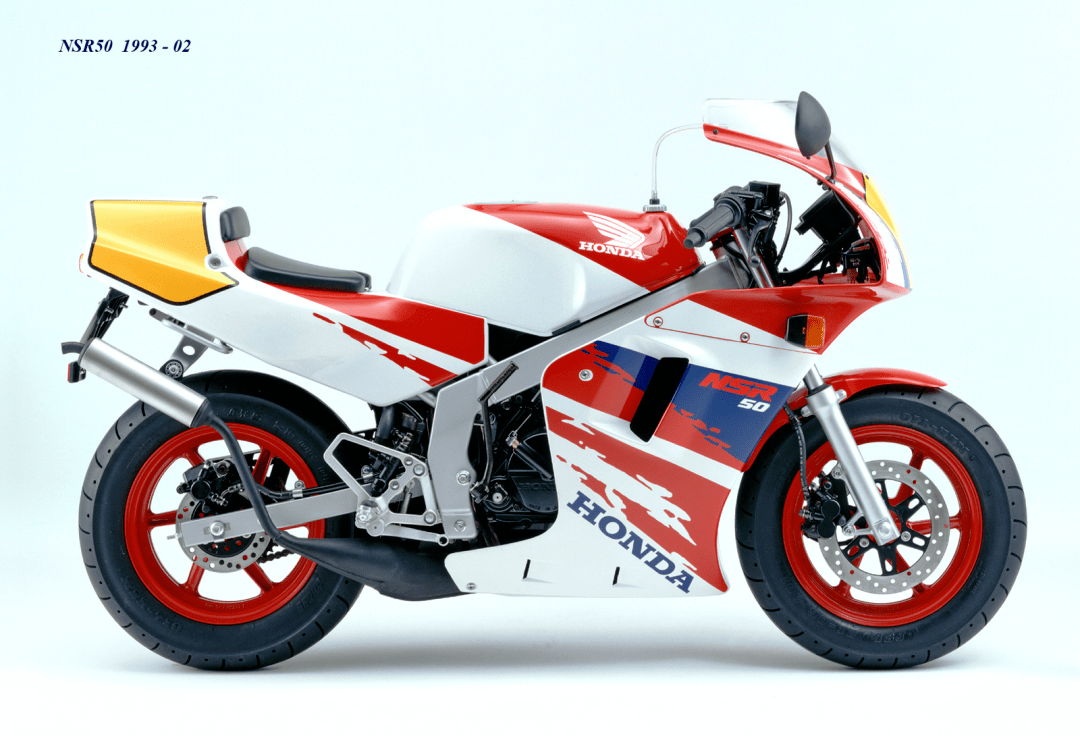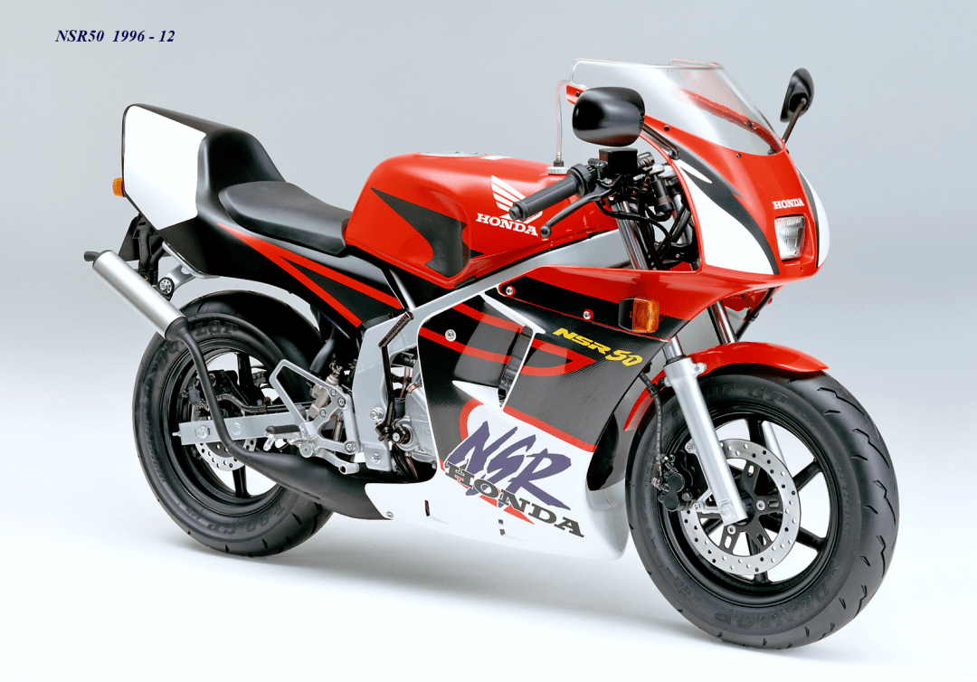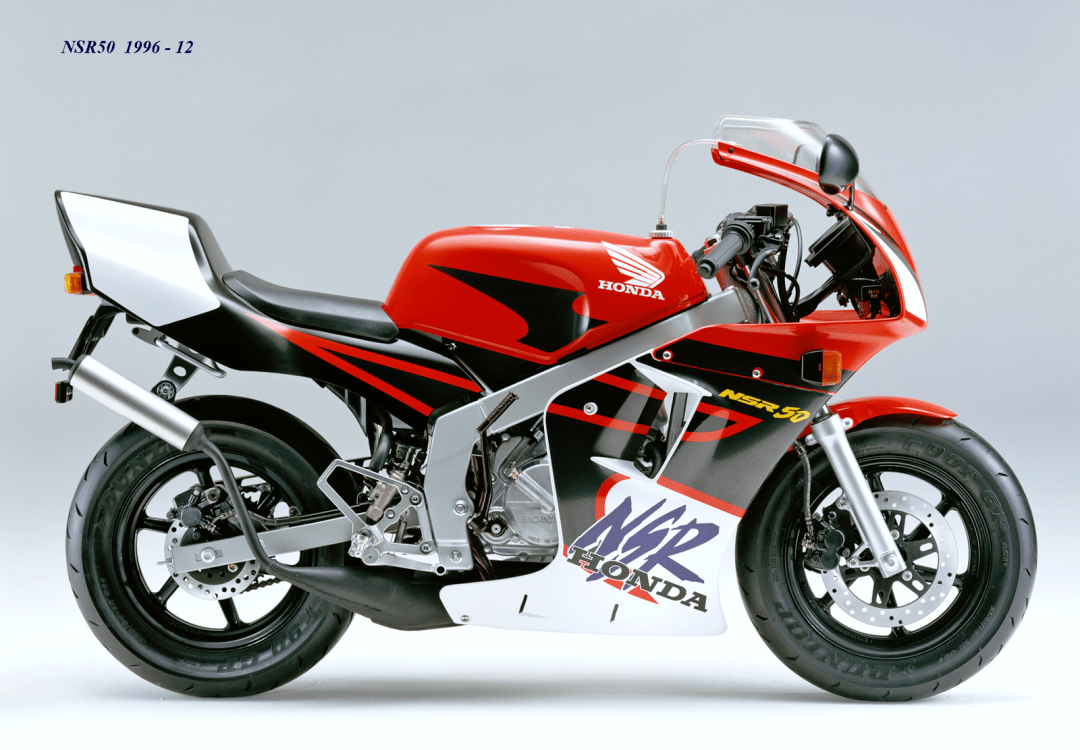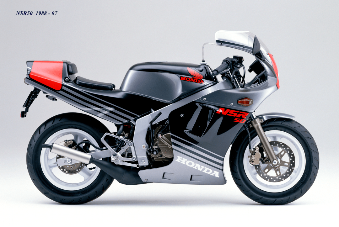 1987 年五月首次發(fā)布的 NSR50(工廠編號(hào) AC10),搭載一副工廠編號(hào)為 AC08E 的水冷兩沖程單氣缸的發(fā)動(dòng)機(jī),缸徑、行程為 39 mm x 41.4 mm,排氣量 49 cc,六檔的變速齒輪箱,最大動(dòng)力輸出 7.2 匹。車體采用一副鐵制的雙翼樑式車架,有著 NSR250 初代風(fēng)格的全車整流罩,前后碟式的制動(dòng)系統(tǒng),直徑為 12 英寸的前后車輪,全車整備重量 85 公斤。