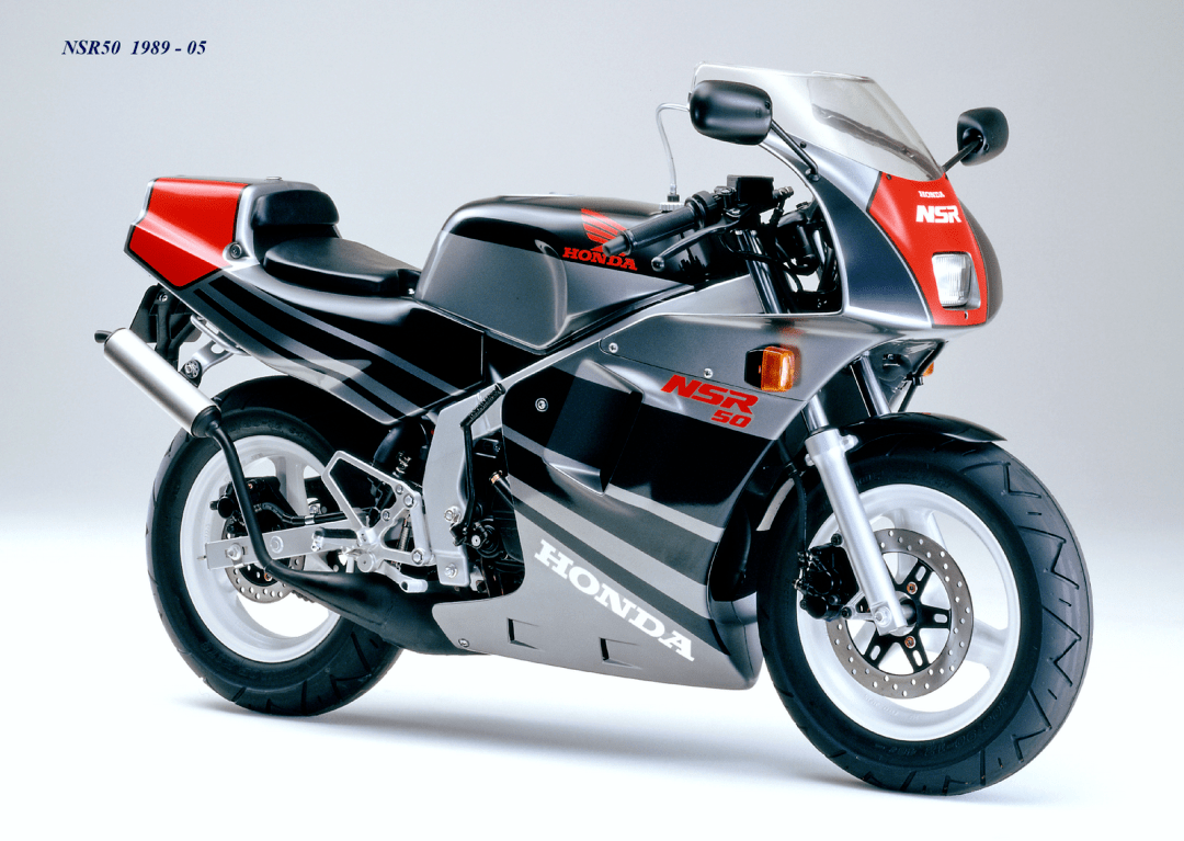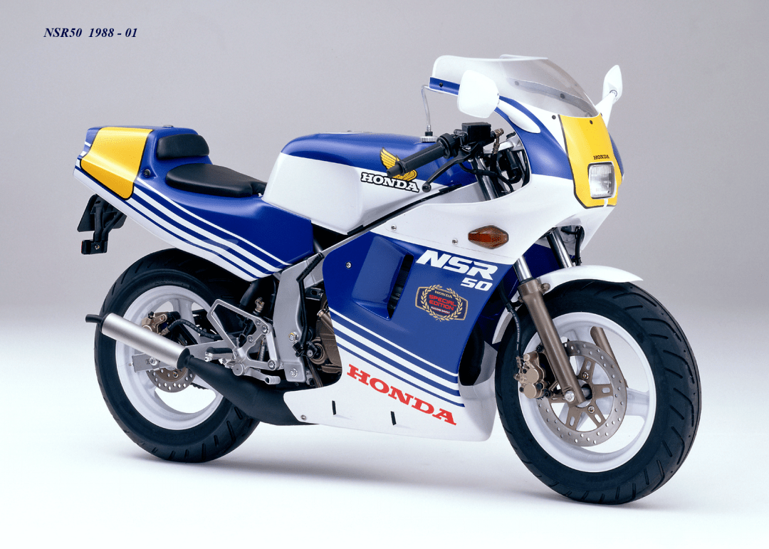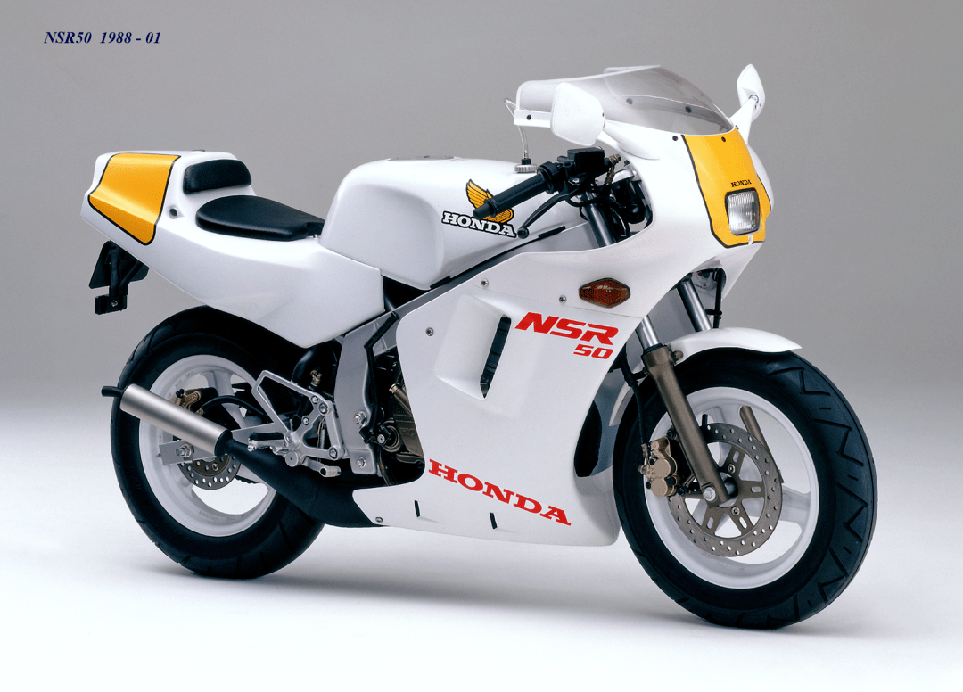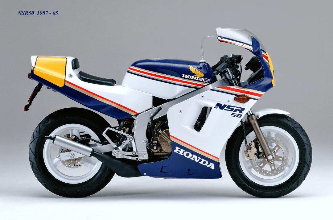 1987 年五月首次發(fā)布的 NSR50(工廠編號(hào) AC10),搭載一副工廠編號(hào)為 AC08E 的水冷兩沖程單氣缸的發(fā)動(dòng)機(jī),缸徑、行程為 39 mm x 41.4 mm,排氣量 49 cc,六檔的變速齒輪箱,最大動(dòng)力輸出 7.2 匹。車體采用一副鐵制的雙翼樑式車架,有著 NSR250 初代風(fēng)格的全車整流罩,前后碟式的制動(dòng)系統(tǒng),直徑為 12 英寸的前后車輪,全車整備重量 85 公斤。