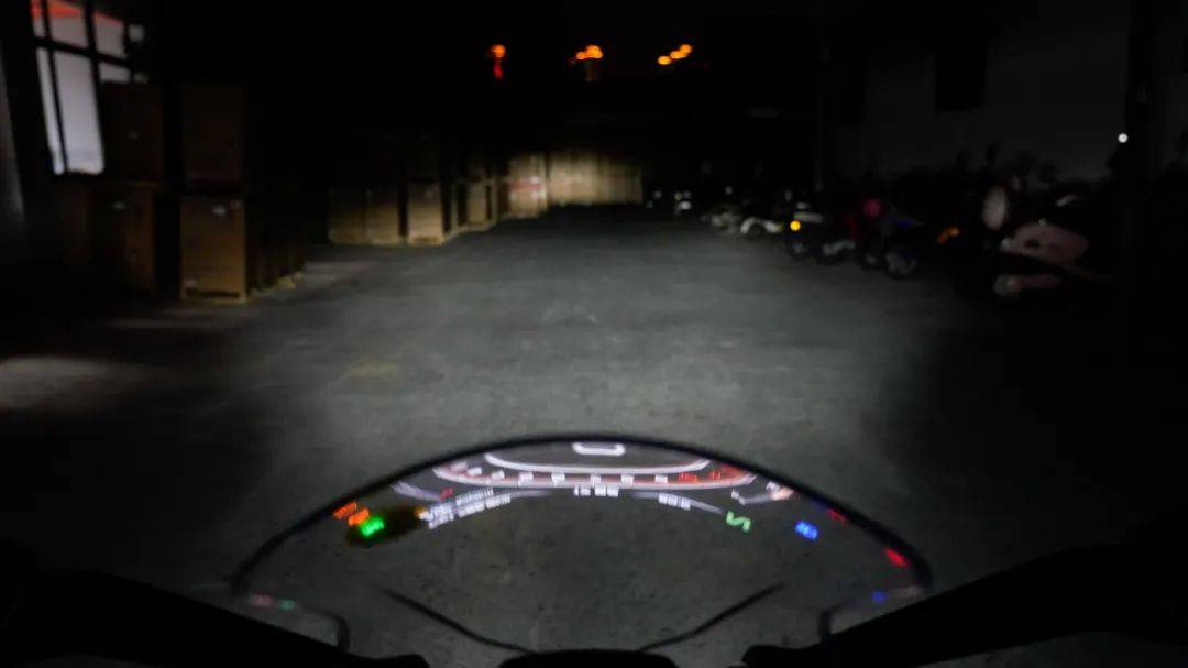 賽450是透鏡大燈,450SR是反光瓦大燈。亮度上,夜間實(shí)測(cè)肉眼可見的賽450更亮一些。