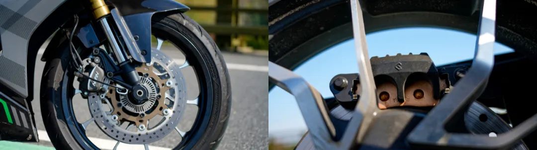 賽450配備前300mm雙碟,每碟單向雙活塞日信卡鉗,后240mm單碟,日信單向雙活塞卡鉗。
