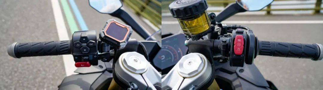 兩車都是全彩TFT儀表,可投屏,UI設(shè)計(jì)完全不同,看各人喜好。賽450儀表是常見款,四周有黑邊框,450SR為曲面屏且直接延伸到上下兩邊。視覺上,賽450R的儀表看起來更高級(jí)一點(diǎn)。