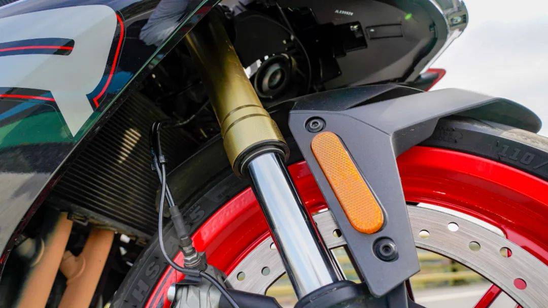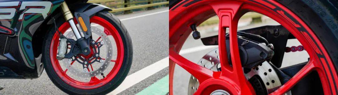 450SR配備320mm單碟配Brembo對(duì)四卡鉗,后240mm航特對(duì)向雙活塞卡鉗。賽450前剎規(guī)格更高,450SR前剎品牌更強(qiáng),實(shí)際制動(dòng)效能如何呢?