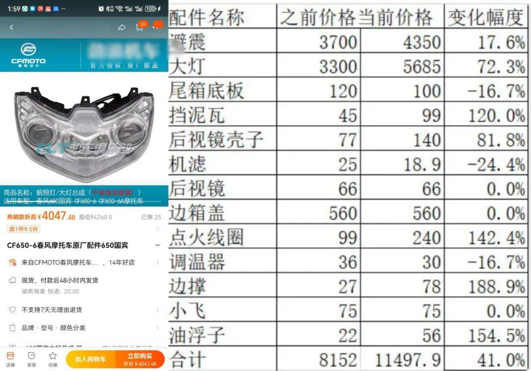此外在配件成本上,錢江的配件價(jià)格要便宜很多,而春風(fēng)的配件價(jià)格的昂貴是出了名的,網(wǎng)上吐槽春風(fēng)配件貴的帖子多如牛毛,摔不起的春風(fēng)車不是浪得虛名。比如上圖的這個(gè)集成了轉(zhuǎn)向燈的后視鏡,也是摔車必?fù)Q的配件,某寶上的一個(gè)所謂原廠件就要三百元,商家報(bào)價(jià)只會(huì)更貴。春風(fēng)國(guó)賓650一個(gè)大燈總成,某寶上零售價(jià)就是4047元,而經(jīng)銷商報(bào)價(jià)甚至能到5000元以上(如下圖,為車主網(wǎng)上吐槽發(fā)布的國(guó)賓650配件價(jià)格對(duì)比表,未經(jīng)證實(shí)),接近1/10的車價(jià)了,這就有點(diǎn)恐怖了!與之相對(duì)的貝納利黃巡的大燈總成價(jià)格是850元,可謂天壤之別。