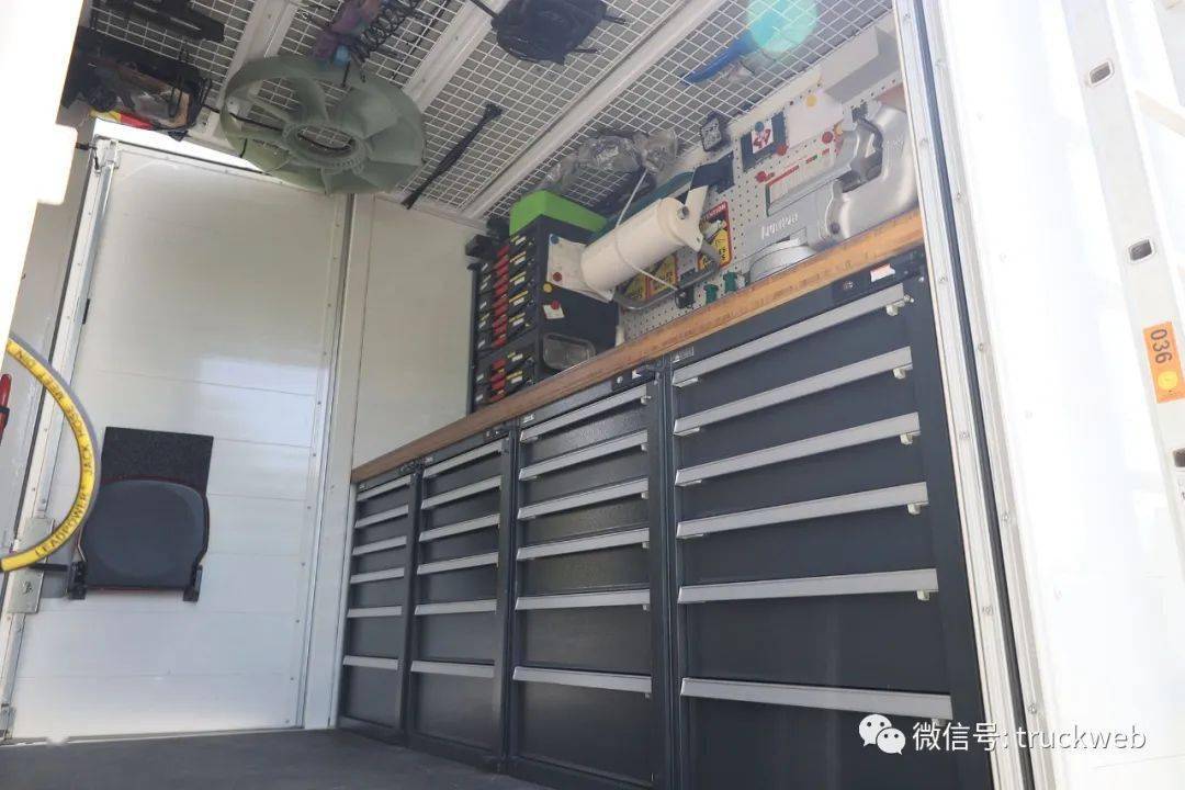 卡車后方的車廂內(nèi)就是一個小型的維修車間,除了琳瑯滿目的賽車配件,車內(nèi)還備有各種工具以備不時之需。畢竟這是在全世界最艱苦的比賽里面,賽車的損耗程度遠(yuǎn)遠(yuǎn)高于其它比賽。