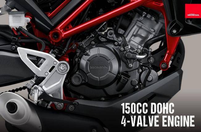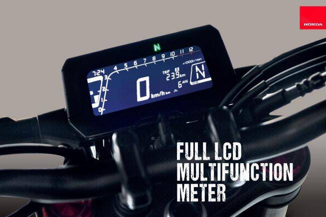 CB150R 使用的是一臺(tái)149mL排量,單缸水冷DOHC 4氣門電噴發(fā)動(dòng)機(jī),壓縮比11..3:1,最大馬力16.1PS。整車配置上,采用了前41mm的倒置前叉,前制動(dòng)為Nissin對(duì)向四活塞輻射卡鉗,匹配了IMU聯(lián)動(dòng)的雙通道ABS,后胎更是使用了150/60的超寬規(guī)格,這在同級(jí)別的本田車中幾乎很難見到。除此之外,CB150R全車使用LED光源,液晶儀表,儀表除了有轉(zhuǎn)速、時(shí)速、油耗、擋顯、時(shí)間、里程以外,還帶有油耗顯示功能。