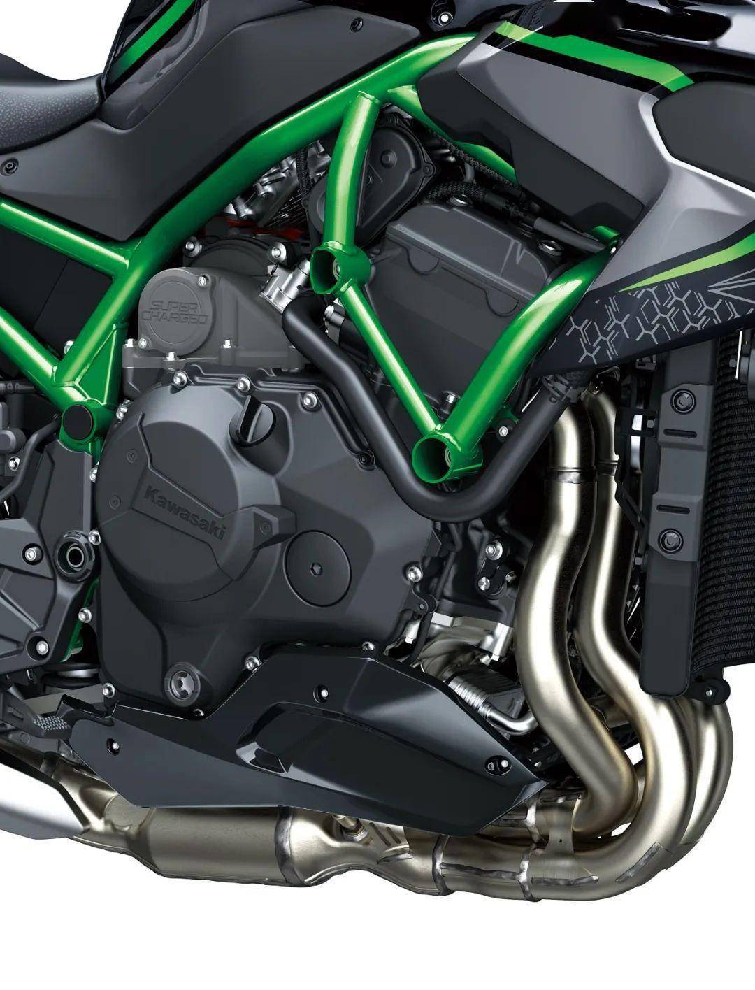 這臺(tái)暴力美學(xué)的典范之作,核心在于那顆采用了機(jī)械增壓的并列四缸發(fā)動(dòng)機(jī)。經(jīng)過增壓后,進(jìn)氣壓力進(jìn)一步提高,在相同時(shí)間內(nèi)壓入更多的氣體,榨取更多的能量。川崎將之稱為“第二代平衡機(jī)械增壓發(fā)動(dòng)機(jī)”,因?yàn)槿~輪、進(jìn)氣系統(tǒng)、排氣系統(tǒng)、活塞、汽缸、汽缸頭、曲軸、凸輪軸、扼流閥體等都是新的設(shè)計(jì),齒輪比也作了修改,因而在低轉(zhuǎn)速時(shí),獲得了比第一代更強(qiáng)的扭矩輸出。