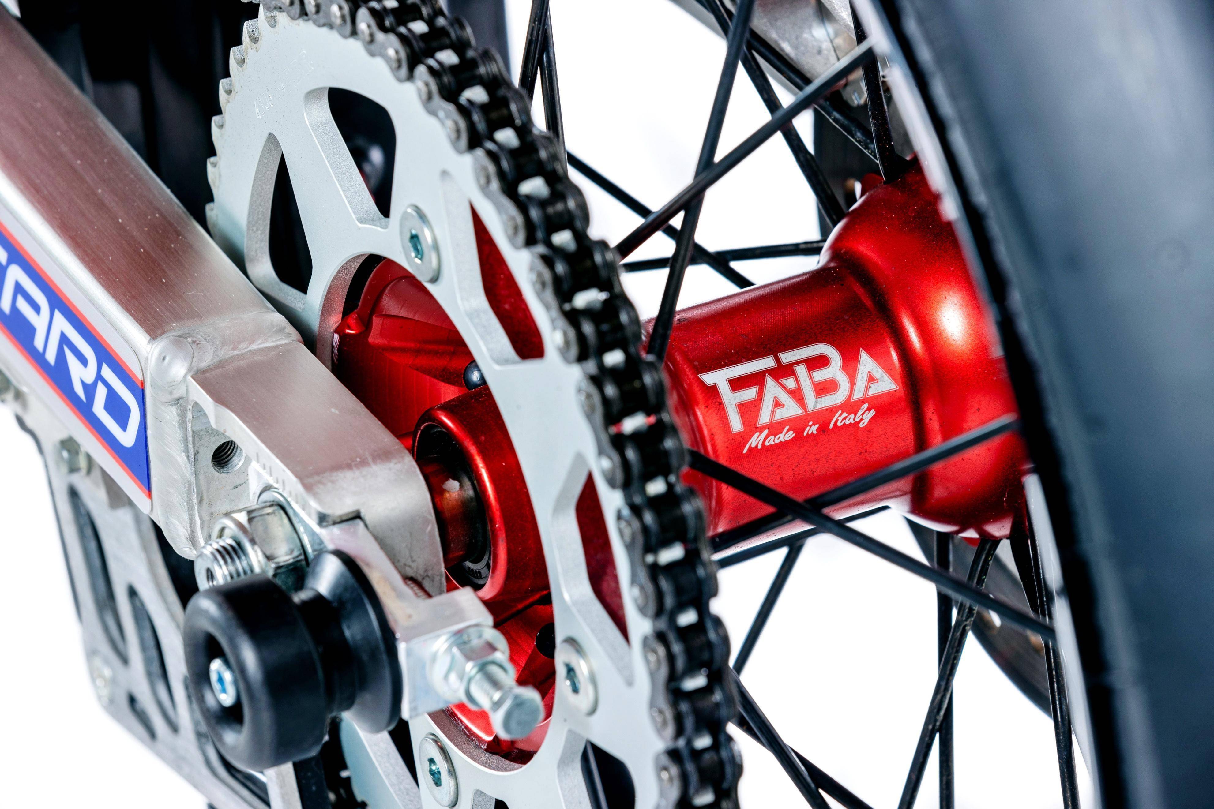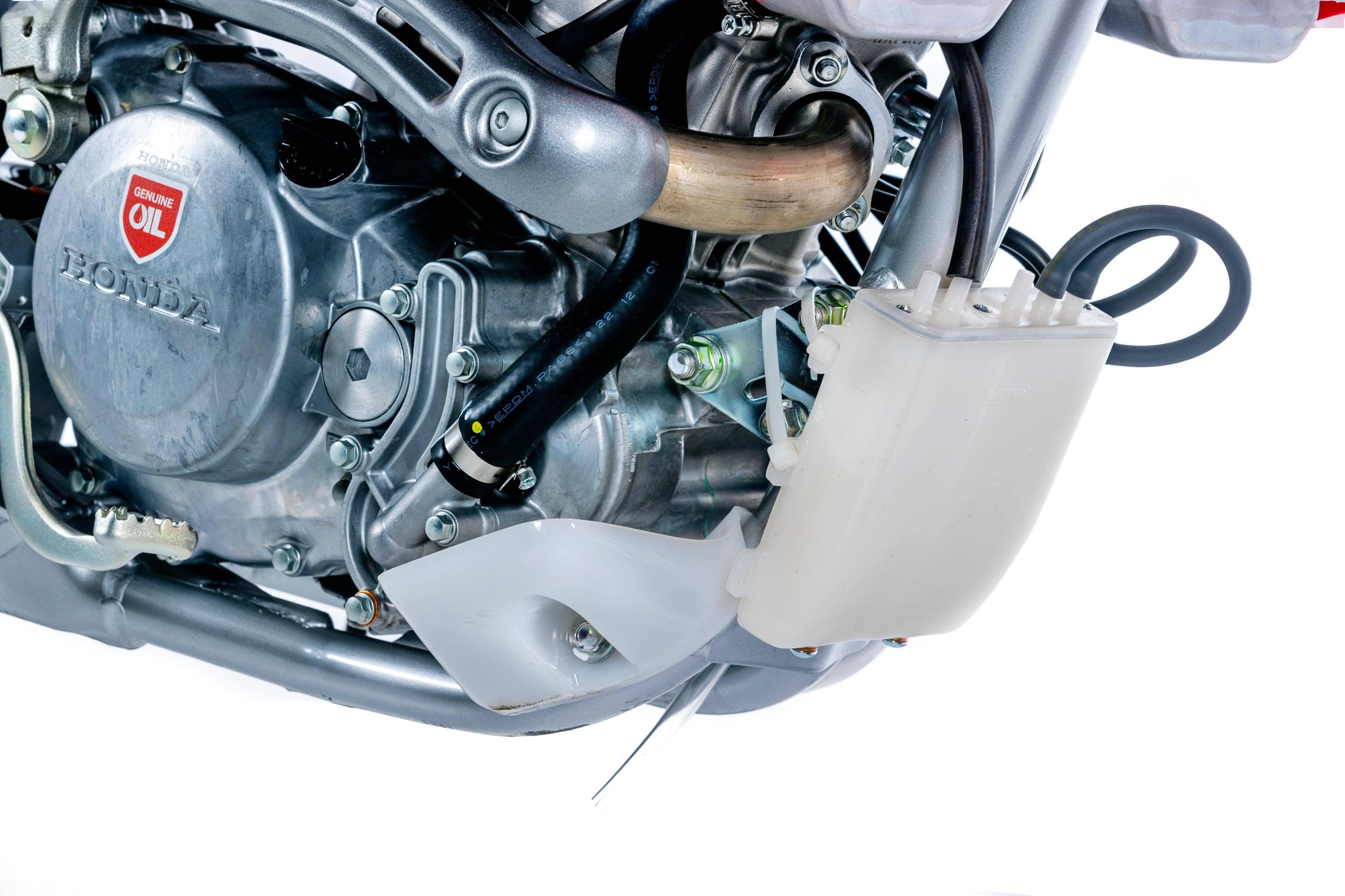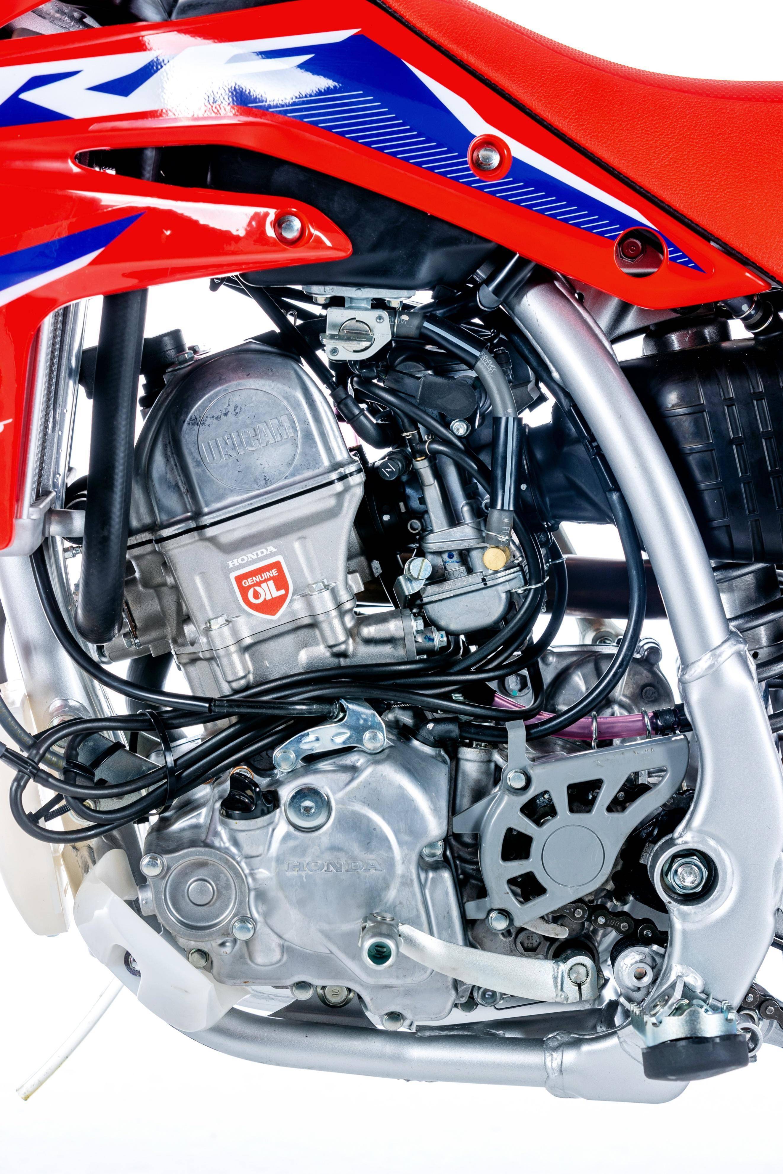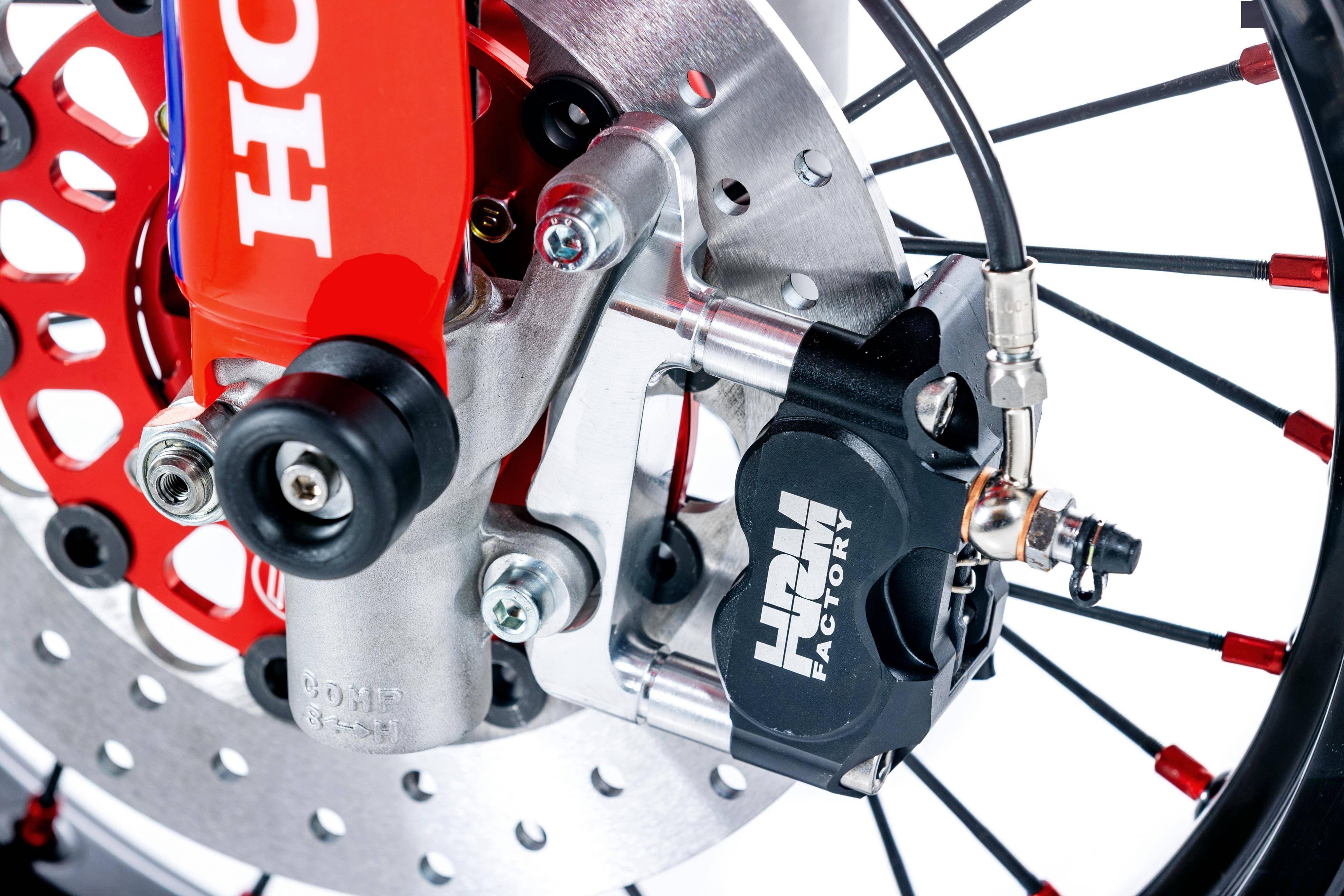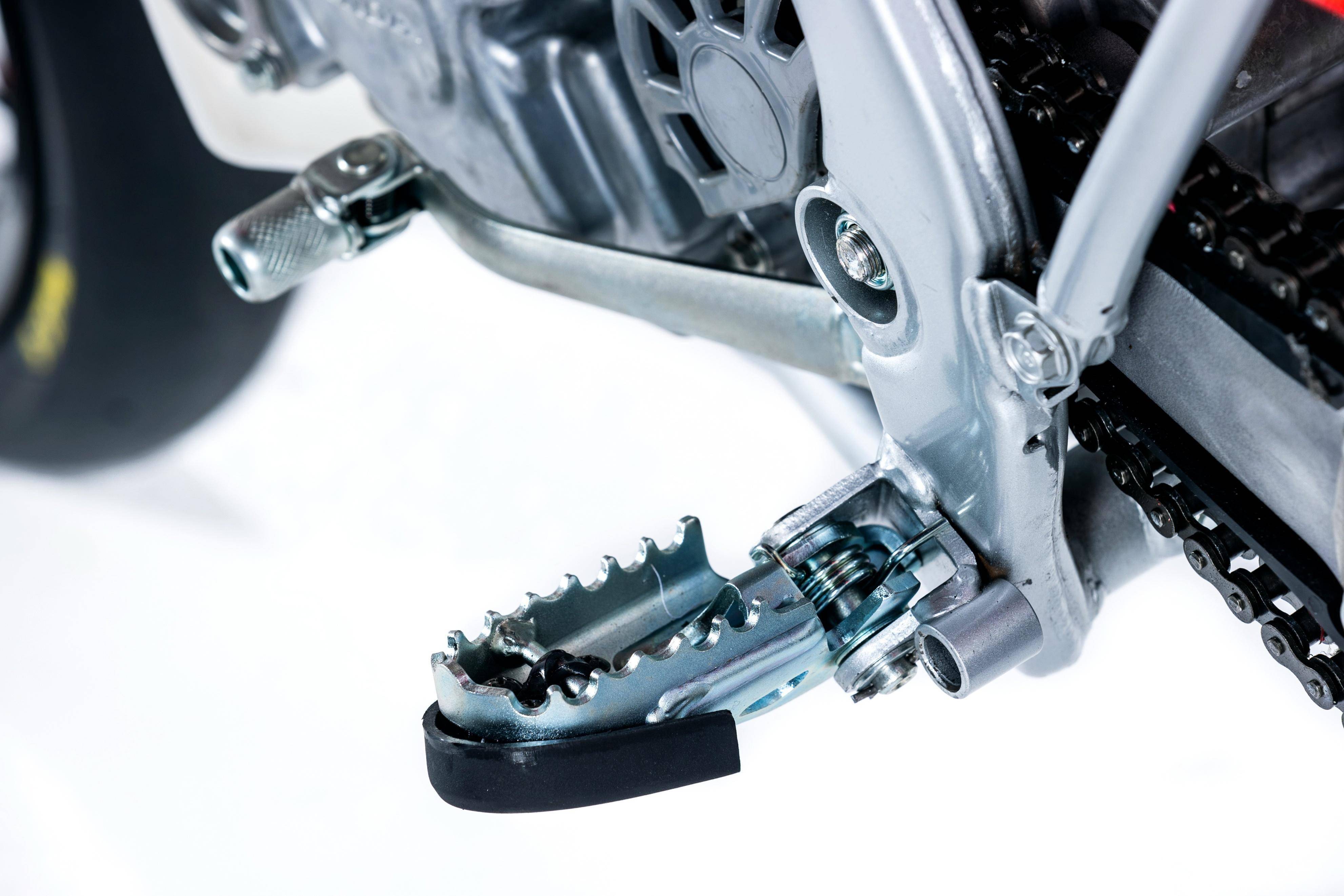 車體方面,沿用了 CRF150R 現(xiàn)有的鋼管制半搖籃式車架,Showa 配套的前后懸掛系統(tǒng),前 230 mm、后 190 mm 的波浪式剎車碟,更好制動效能的徑向安裝前剎車卡鉗,對應(yīng)公路型賽車的 CNC 制腳踏等。而焦點的變化,是前后車輪,從場地越野規(guī)格的前 17、后 14 英寸直徑的車輪(標(biāo)準(zhǔn)款,另有使用前 19、后 16 英寸的 CRF150R2/CRF150RB 大車輪版),修改為前后 12 英寸和前后 17 英寸,并采用了公路賽所使用的競技輪胎。