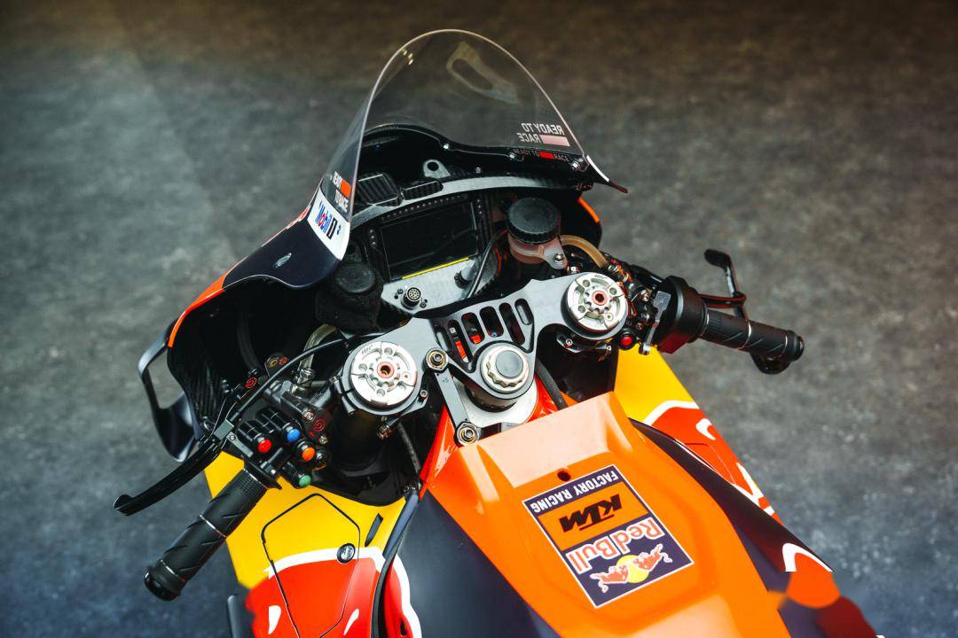 KTM 的 MotoGP 工廠(chǎng)賽車(chē) RC16,搭載一副 V 型 90 度(另一說(shuō)法是 86 度)四氣缸的發(fā)動(dòng)機(jī),缸徑、行程為 81 mm x 48.5 mm(注:參考 MotoGP 級(jí)別的賽車(chē)技術(shù)規(guī)則,所有參賽車(chē)輛的最大缸徑為 81 mm),排氣量 1000 cc,極限轉(zhuǎn)速可達(dá) 18500 rpm,官方公布的最大動(dòng)力輸出是超過(guò) 265 匹。車(chē)體方面,RC16 采用一副獨(dú)特的、混合結(jié)構(gòu)的鋼制車(chē)架(2016 - 2019 賽季使用鋼管編織狀的車(chē)架),碳釬維的后搖臂(2016 - 2019 賽季主要使用鋁合金制的后搖臂),WP 的懸掛系統(tǒng)等。