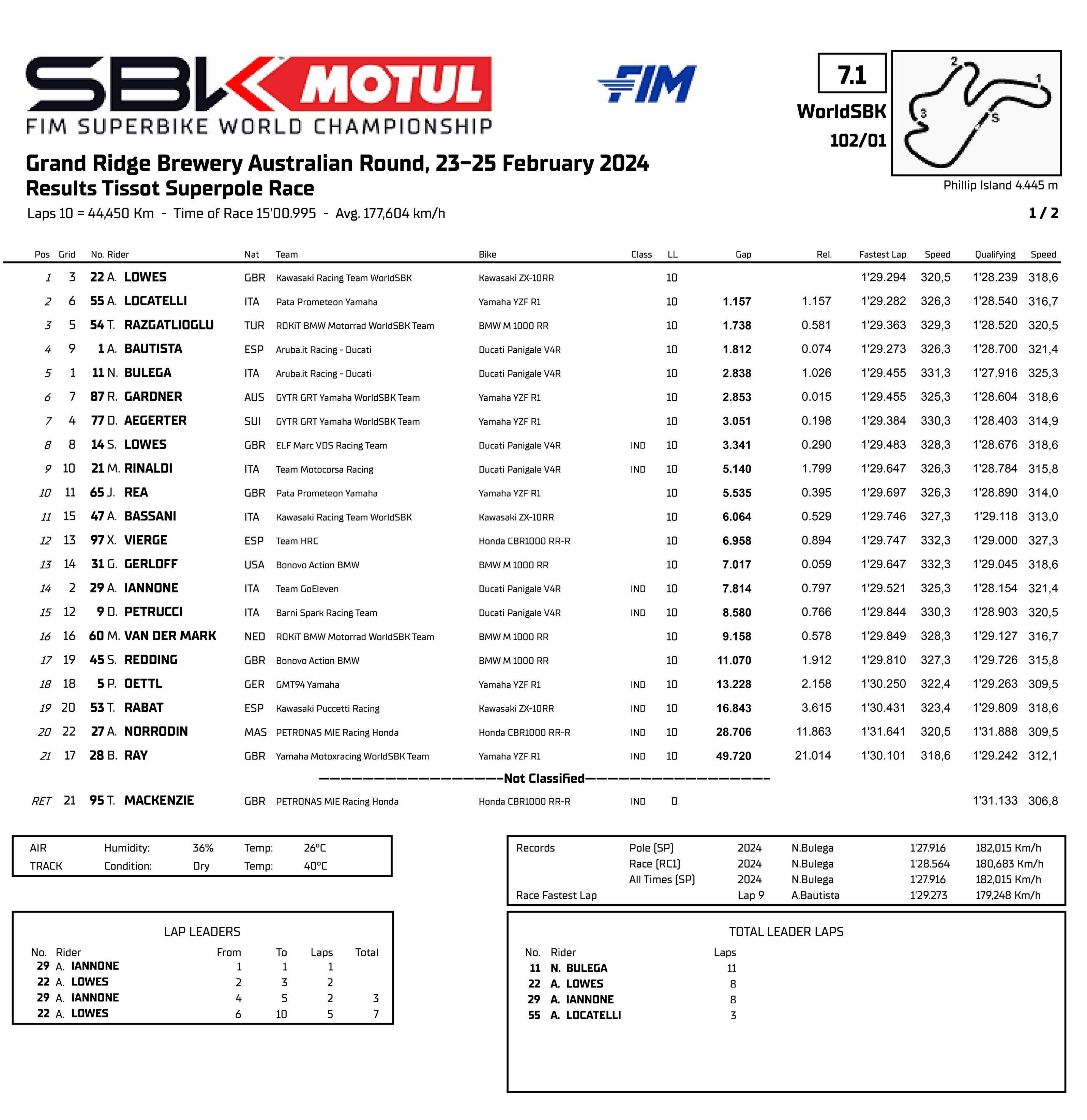WSB 級別賽前的 Super Pole 超級排位賽,11 號車、新升級的 WorldSSP 應屆世界冠軍布雷加(Nicolo Bulega),以打破紀錄的 1 分 27.916 秒圈速(舊紀錄為 1 分 29.23 秒)、奪得了第一節(jié)正賽的排頭位發(fā)車;后面,29 號車、因禁藥事件停賽四年期滿而復出的恩諾尼(Andrea Iannone),22 號車洛維斯(Alex Lowes)分別排在第二、第三位起步。