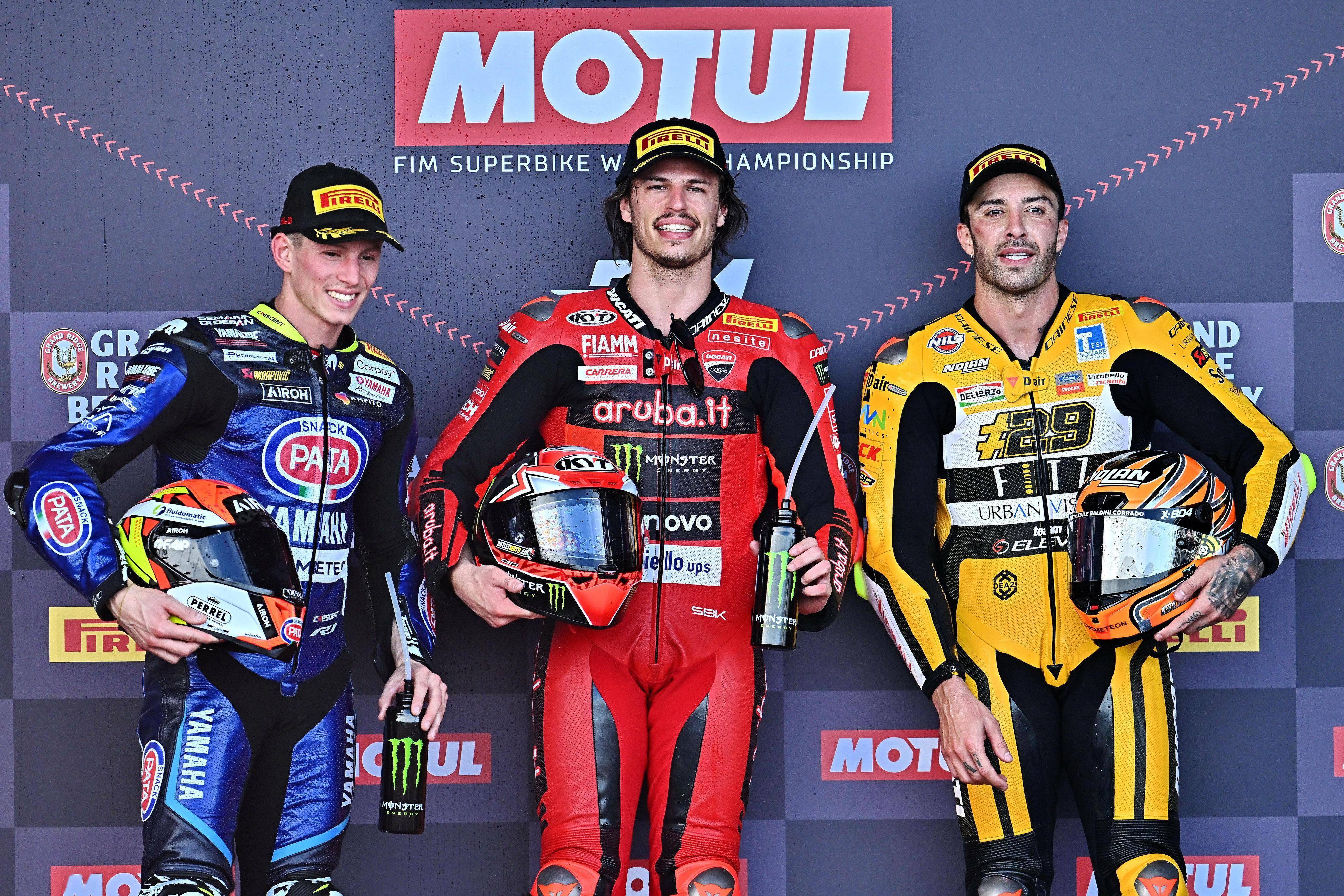 全部車手都換完了輪胎之后的第 12 圈,布雷加取得領(lǐng)先位置、并已與后車拉開了一定的距離,恩諾尼、54 號車的拉格里奧盧(Toprak Razgatlioglu)在第二、第三的位置上進行追逐。最終,布雷加順利拿下了第一節(jié)比賽的勝利,升級之后的首場比賽就拿下冠軍。55 號車的洛卡泰利(Andrea Locatelli)和恩諾尼落后頭車 2 秒多,分別拿到了亞軍和季軍。三位意大利車手占據(jù)了 2024 賽季第一場比賽的頒獎臺,這是繼 1993 年的圣馬利諾站比賽之后、再次出現(xiàn)的場景。
