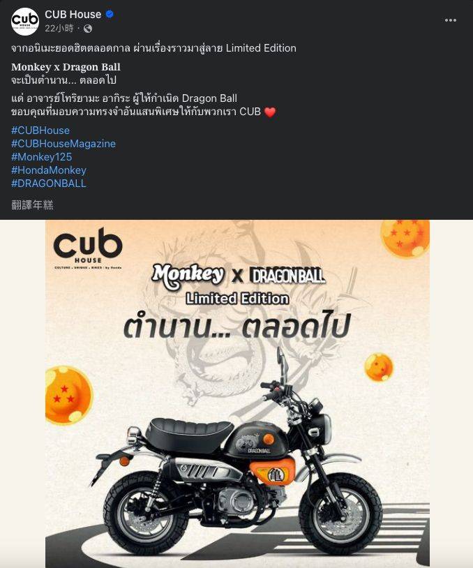 前陣子日本知名漫畫《七龍珠》的創(chuàng)作者、一代漫畫大師鳥山明因病去世,讓無數(shù)喜愛七龍珠的粉絲感傷不已,鳥山明在七龍珠當(dāng)中也展現(xiàn)他對車輛的熱愛,曾經(jīng)創(chuàng)作出諸多經(jīng)典,像是七龍珠中布瑪?shù)淖{,更被真實(shí)還原推出; 最近Cub House為了表達(dá)對鳥山明的敬意,也在社交媒體上貼出2019年推出的Monkey 125 x Dragon Ball 限量版,也讓人好奇這臺限量版的小猴子是否有機(jī)會重新上市。
