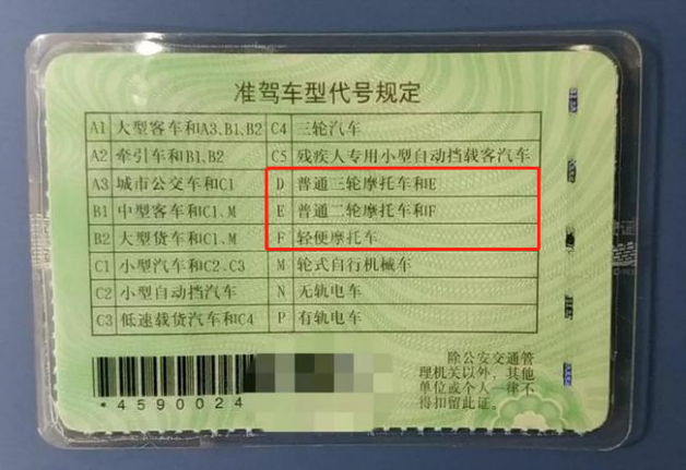 目前摩托車駕駛證一共有三種,D證、E證以及F證。主要區(qū)別是D證準駕兩輪摩托車、三輪摩托車、輕便摩托車,而E證則準駕二輪摩托車、輕便摩托車。F證規(guī)定只能駕駛輕便摩托車??梢钥闯?,D證包含范圍最廣,可以準駕E證和F證的車型。