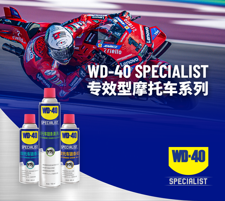 2023年,針對中國市場配方升級的WD-40 Specialist專效型摩托車系列養(yǎng)護(hù)產(chǎn)品上市,三款WD-40摩托養(yǎng)護(hù)新品:WD-40Specialist 摩托車鏈條清潔劑、WD-40Specialist  摩托車鏈條潤滑油、WD-40Specialist  摩托車鏈條蠟。