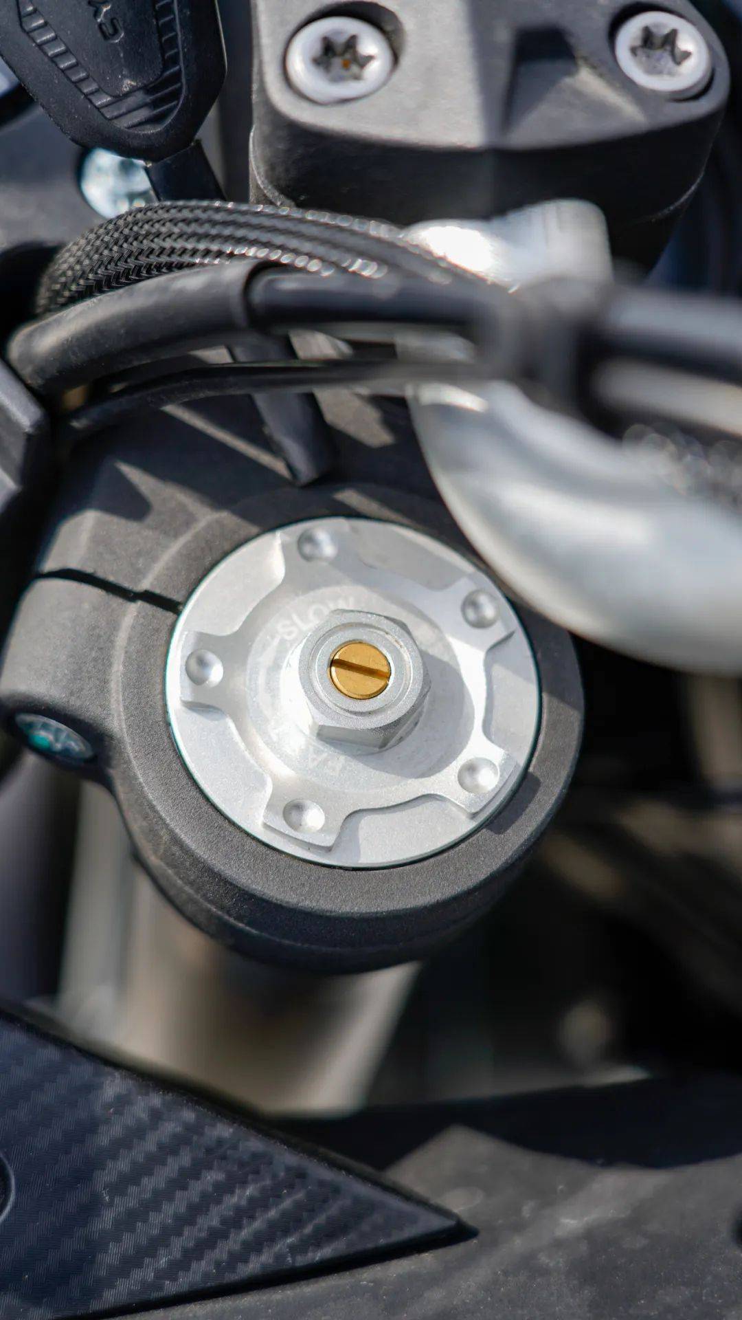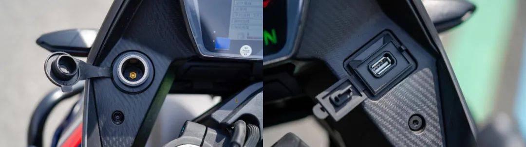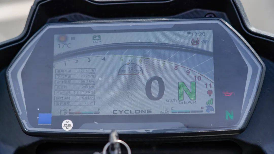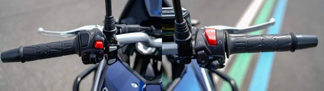 前后全部采用LED燈源,前照燈兩條LED燈帶所帶來的辨識度良好,夜間的照明效果如下圖,燈光的鋪路效果良好,下圖拍攝的圖和實際肉眼觀察效果非常接近??梢娊鉄翡伮贩秶浅4?,加上遠光燈效果更強。這套家族式儀表出鏡率也是相當(dāng)高,顯示信息很全,提供三種UI頁面顯示,通過左手把上的MODE進行切換,值得一提的是這塊兒儀表內(nèi)置了陀螺儀,可以實時顯示傾角角度,對于我們這種跑山愛好者來說,必須大贊。儀表兩側(cè)同時提供點煙器接口以及USB充電接口,功能性實用性兼顧,尤其是在旅行途中保不齊遇到扎胎的狀況,點煙器接口方便為充氣泵供電。開關(guān)部分依然是品牌通用件,按鍵背光在夜晚騎行時提示效果良好,同時功能性齊全,具備雙閃,TC關(guān)閉按鈕,自動大燈等功能。剎車及離合器拉桿均支持可調(diào)功能。
