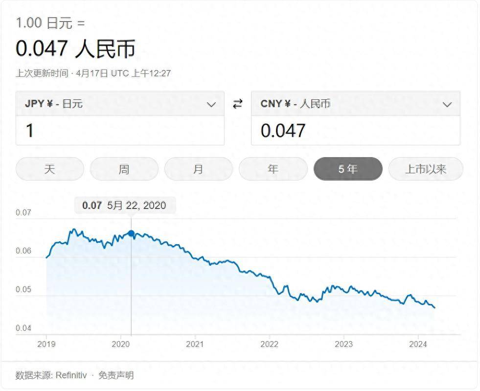 2、今年四月 17 日中午時(shí),是 1 萬日元:大約 470 元人民幣;