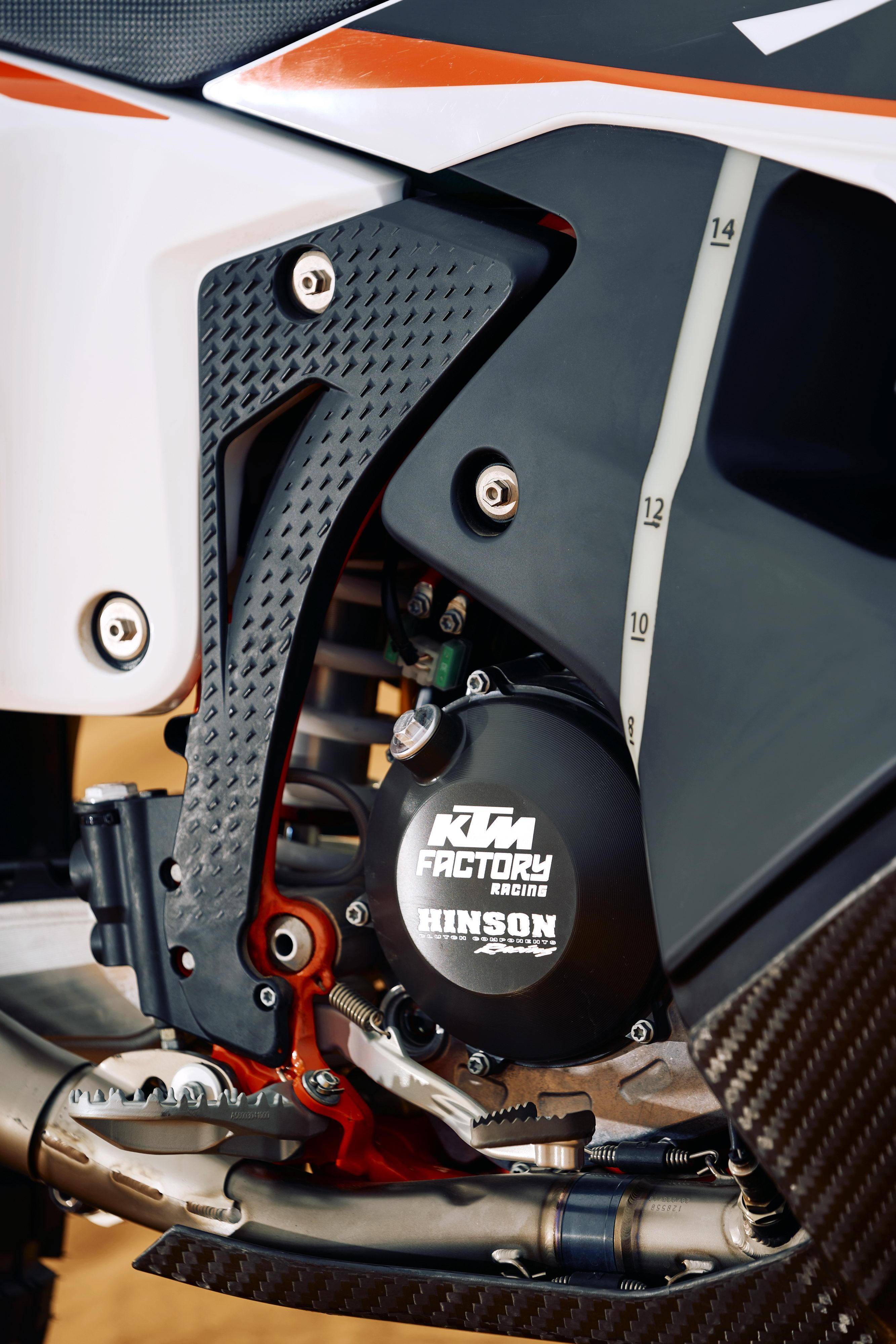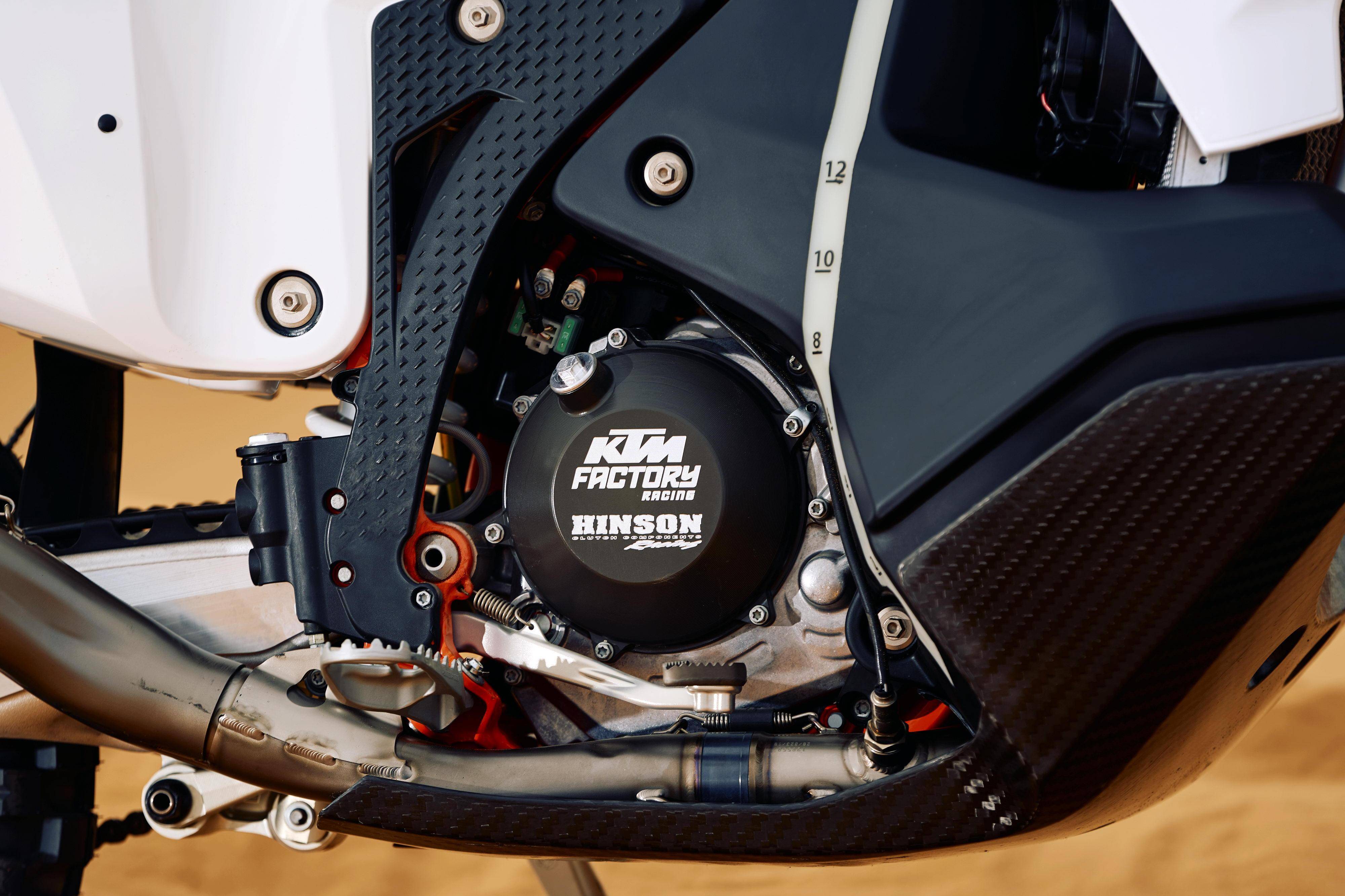 新的 2025 款 KTM 450 Rally Replica 復(fù)制版市售拉力賽車(chē)搭載一副水冷四沖程單氣缸、SOHC 四氣閥的發(fā)動(dòng)機(jī),缸徑、行程為 95 mm x 63.4 mm(與市售越野賽車(chē) 450 SX-F 相同),排氣量 449.3 cc,壓縮比 12.6:1(450 SX-F 的壓縮比為 13:1,而 450 EXC-F 的壓縮比為 12.75:1)。車(chē)體采用一副鋼制的車(chē)架,WP 配套的前后懸掛系統(tǒng),前 21、后 18 英寸直徑的輪框。在設(shè)計(jì)和配置上,新車(chē)的主要特點(diǎn)如下: