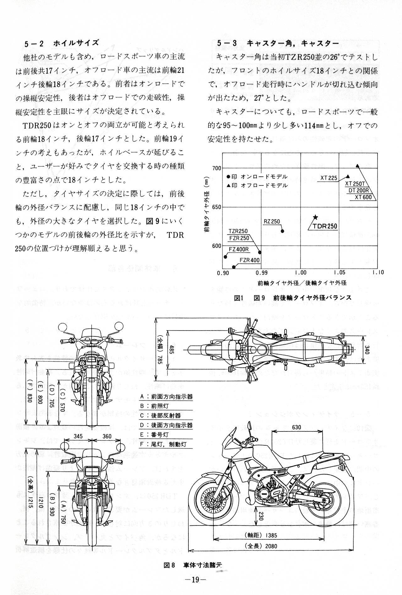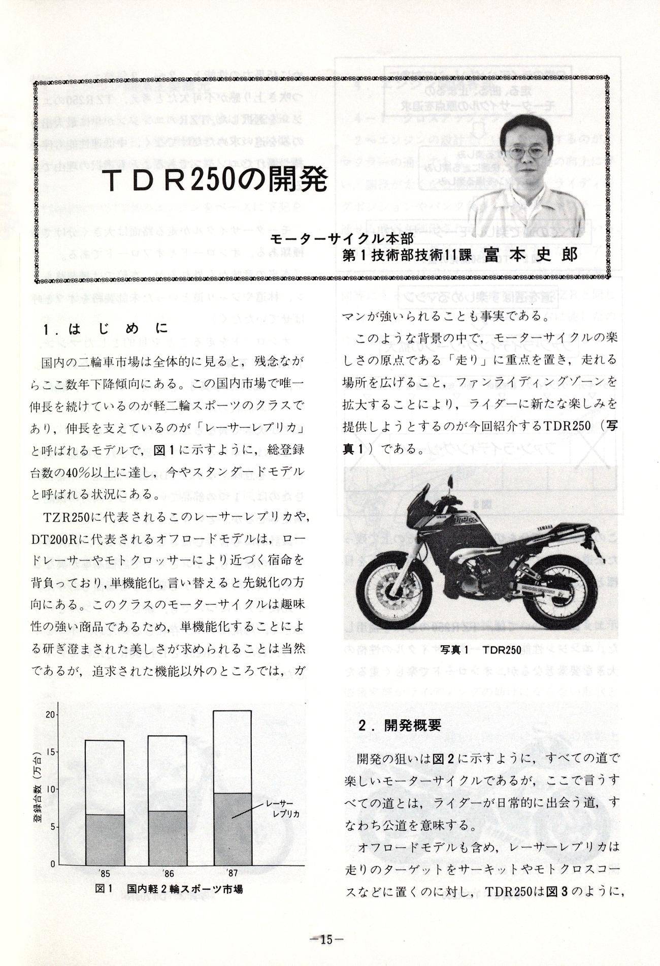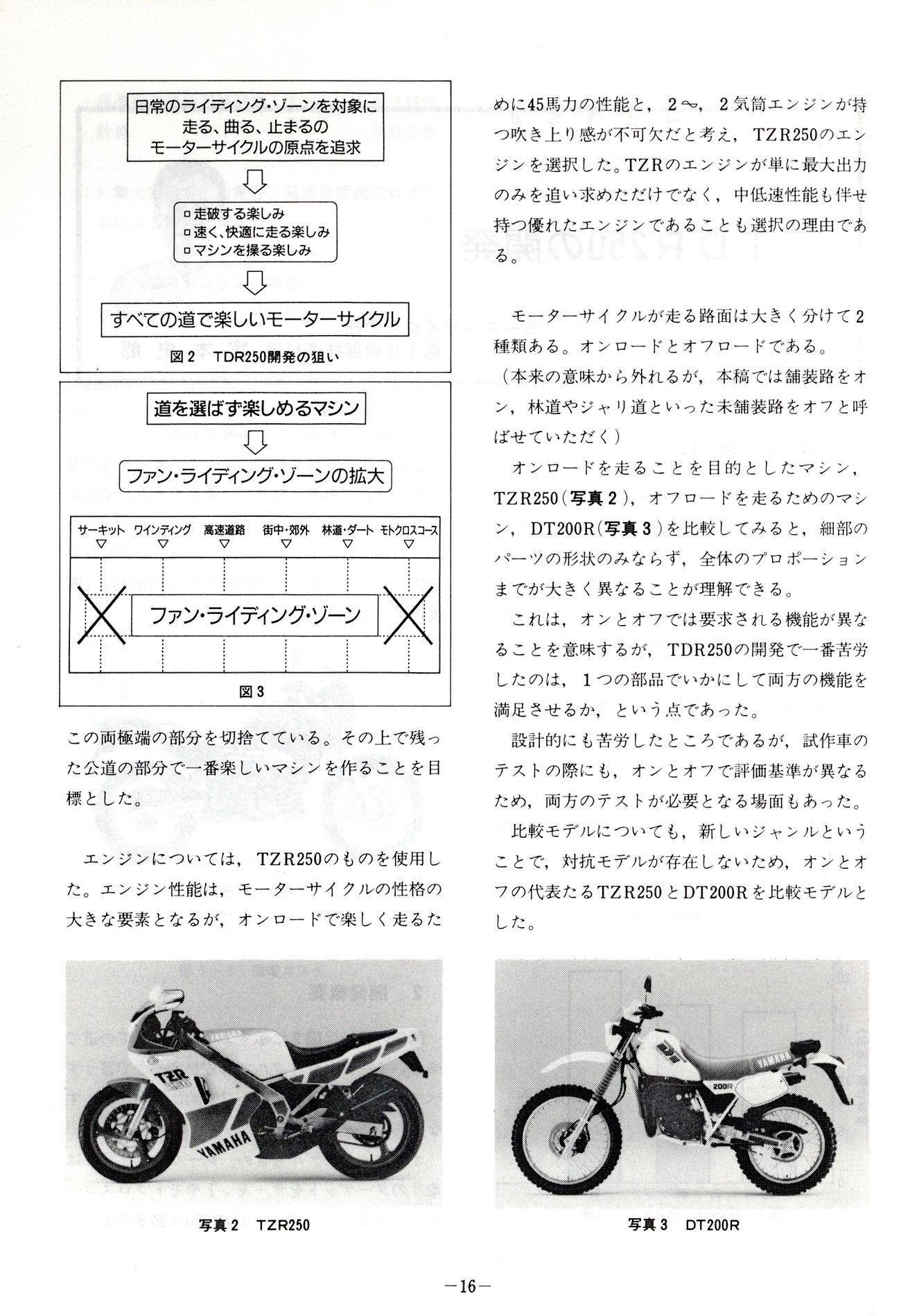 推出 TDR250 的同時(shí),Yamaha 也以技術(shù)文獻(xiàn)的形式,公開了該車的一些設(shè)計(jì)理念。下面是編譯自 1988 年七月發(fā)布《Yamaha 技術(shù)會(huì) 技報(bào) No.6》部分內(nèi)容的摘錄: