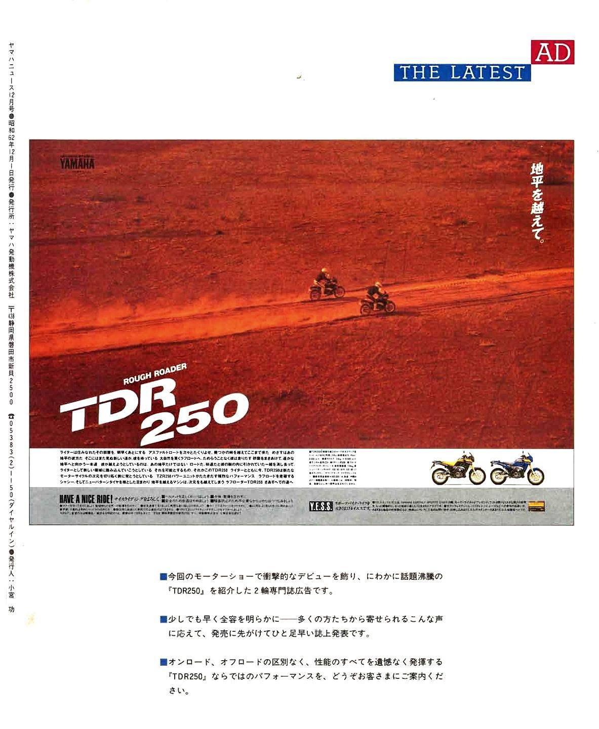 早在 1987 年十月底到十一月初舉行的第二十七屆日本東京車展上,Yamaha 就展示了全新的多功能車型 TDR250。該車當(dāng)時(shí)已經(jīng)被定義為 “ 參考出品車 ”,隨后在 1988 年正式上市。