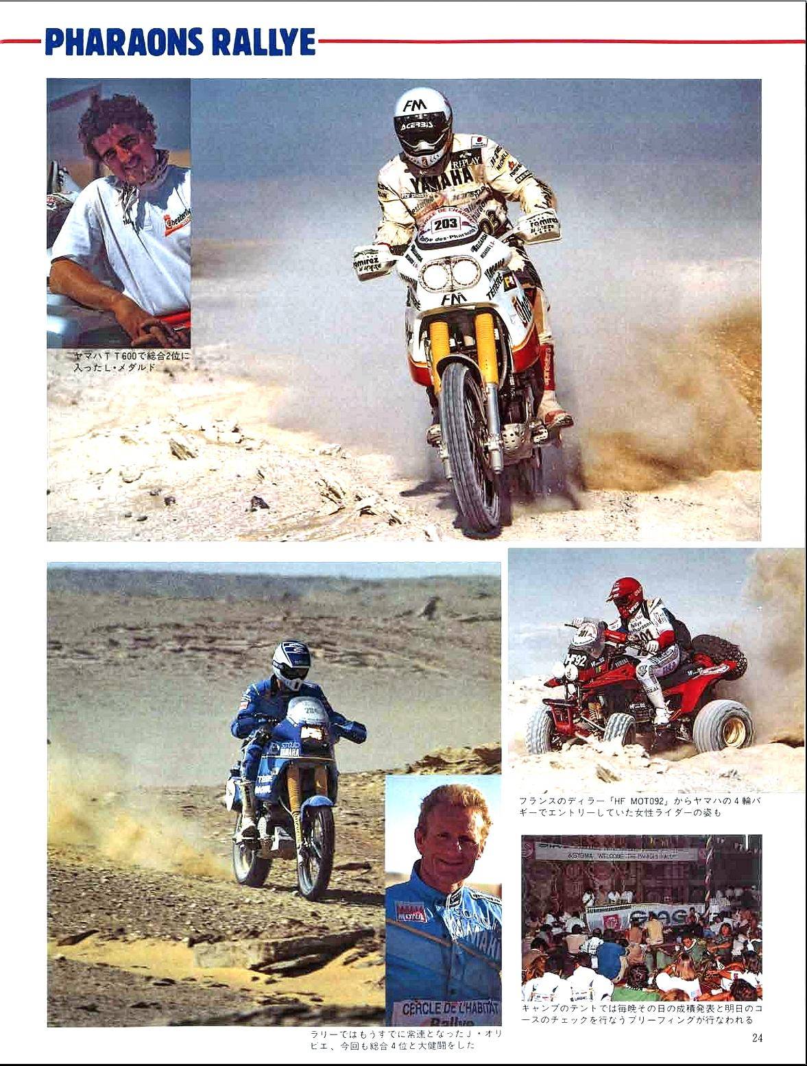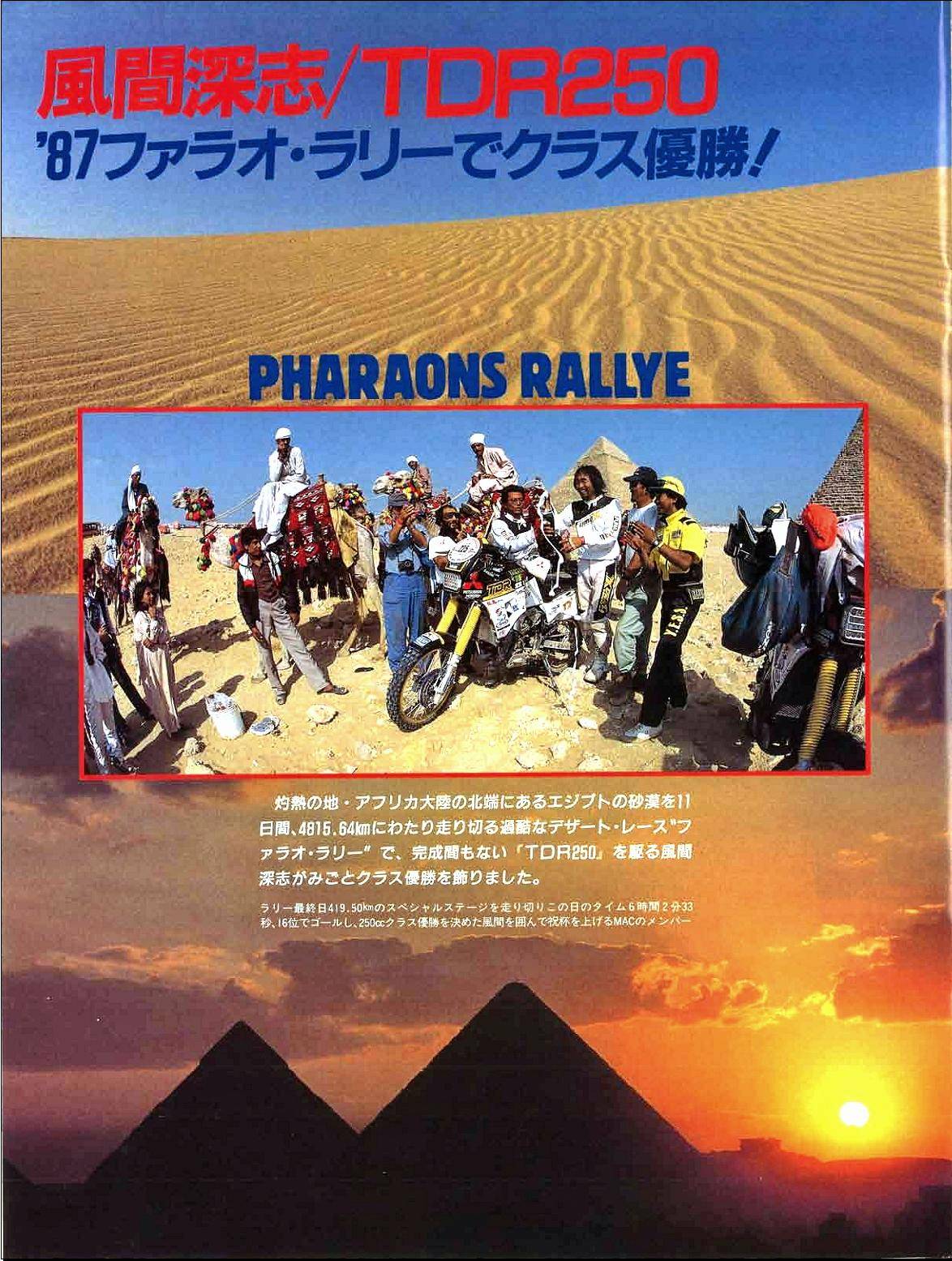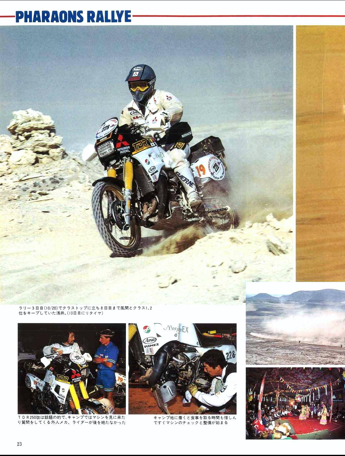 而為了驗(yàn)證其綜合性能并不是 “ 浪得虛名 ”、更不是配套件的堆砌,在 TDR250 開發(fā)之初,Yamaha 就以原型車參加了埃及舉行的法老拉力賽(Rallye des Pharaons),并在這場(chǎng)為期十一天、全程大約 4815 公里的比賽中,奪得了全場(chǎng)第十六名、250 cc 組別的冠軍。