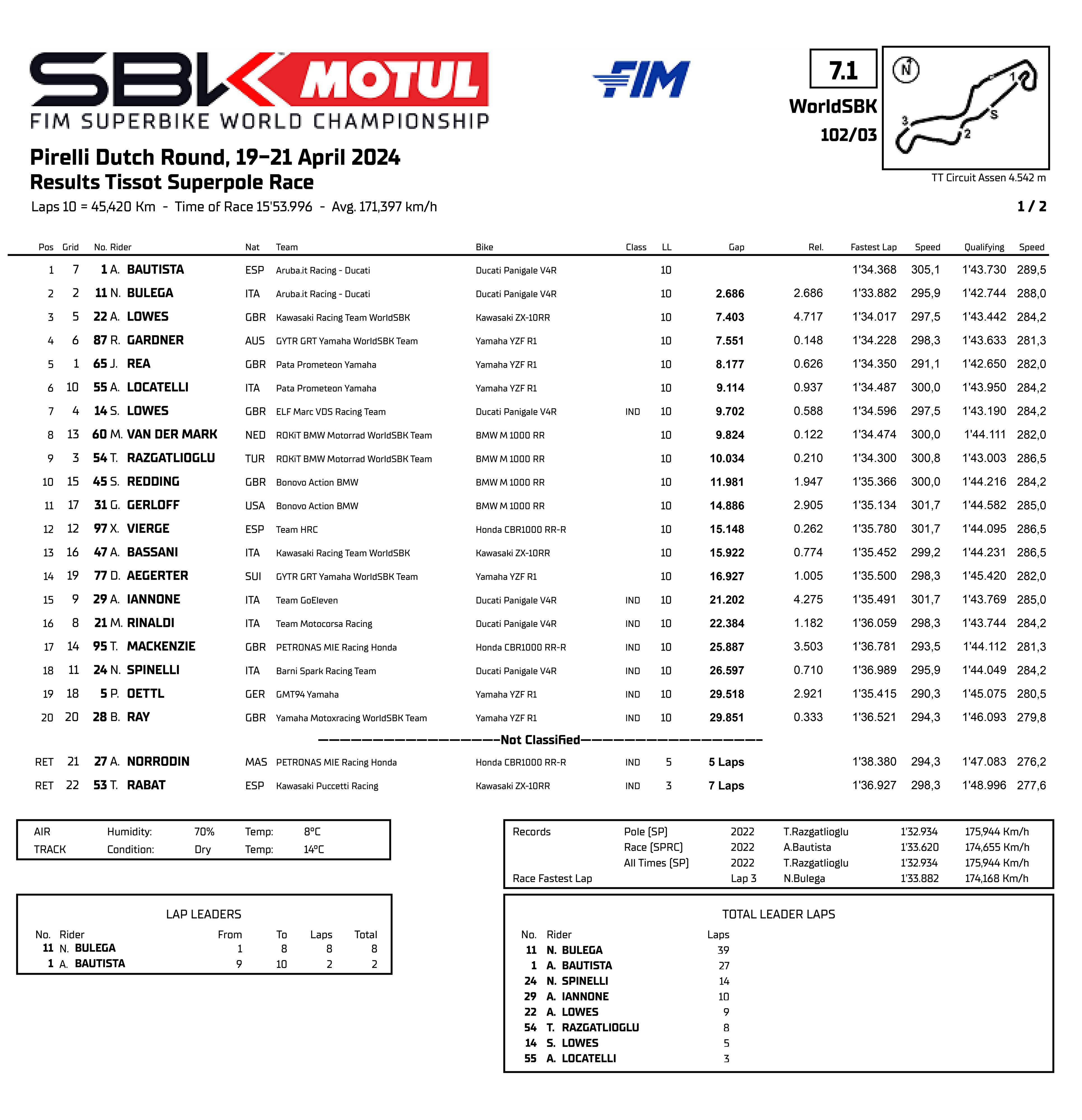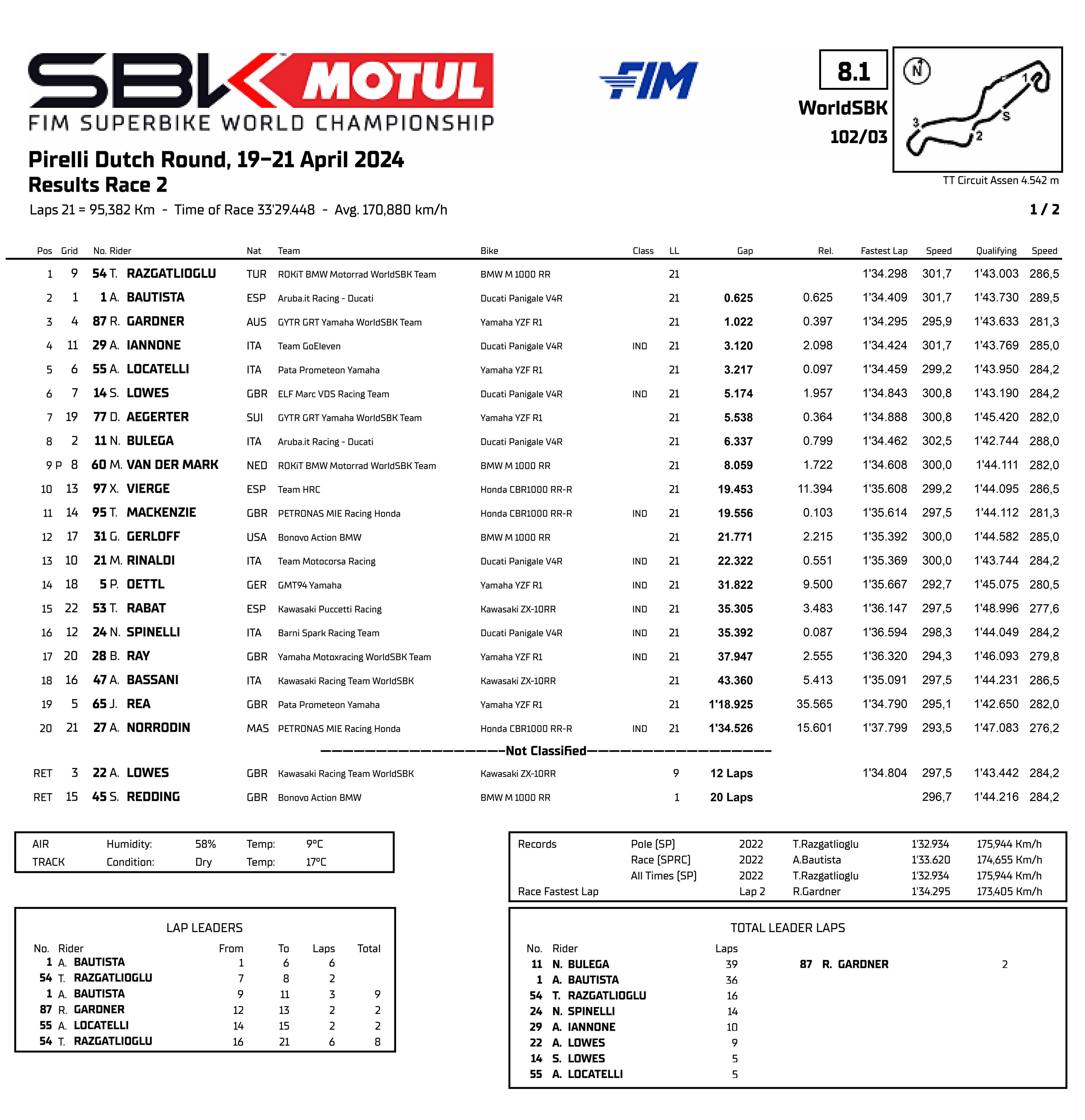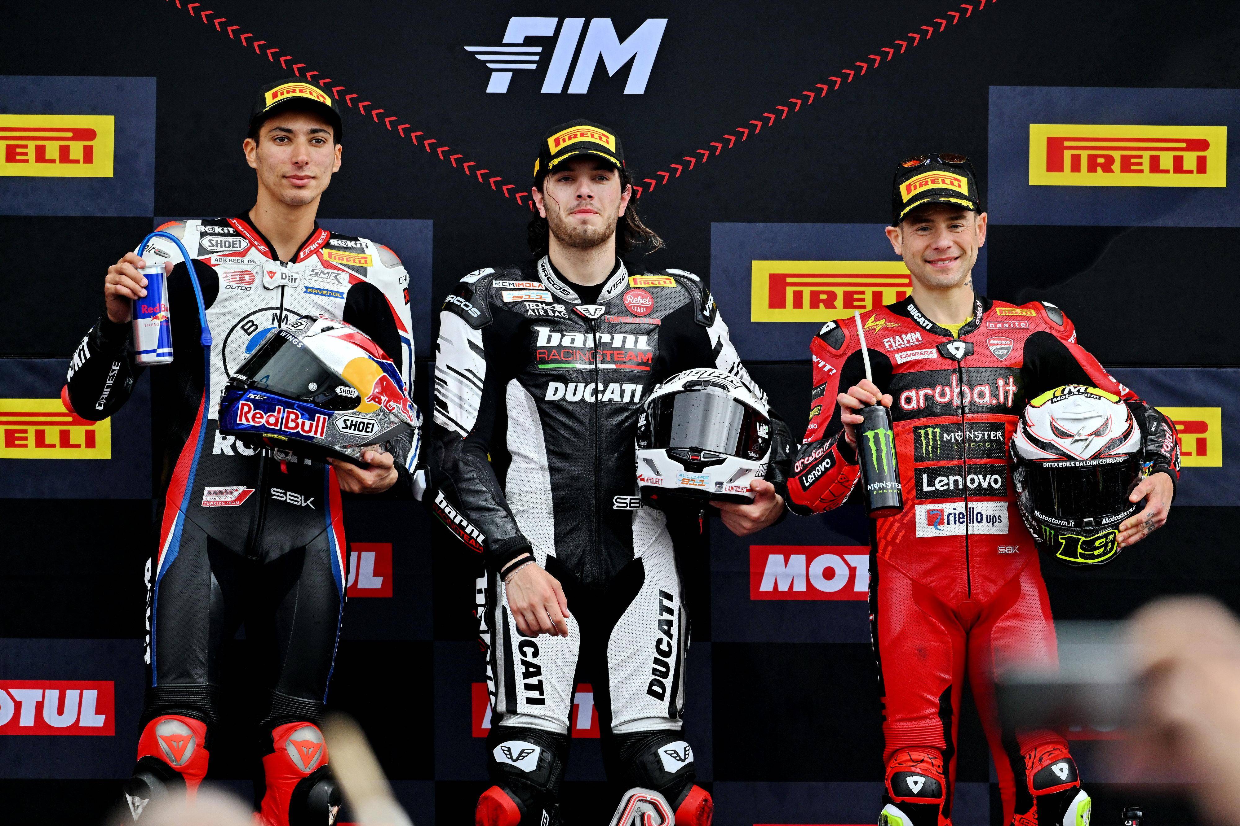 最終,斯比尼利拿到了第一節(jié)比賽的勝利、奪得了他在 WSBK 的首個冠軍,拉格里奧盧落后前車不到 2 秒獲得亞軍,1 號車的捌弟(Alvaro Bautista,巴迪斯塔)拿到季軍。