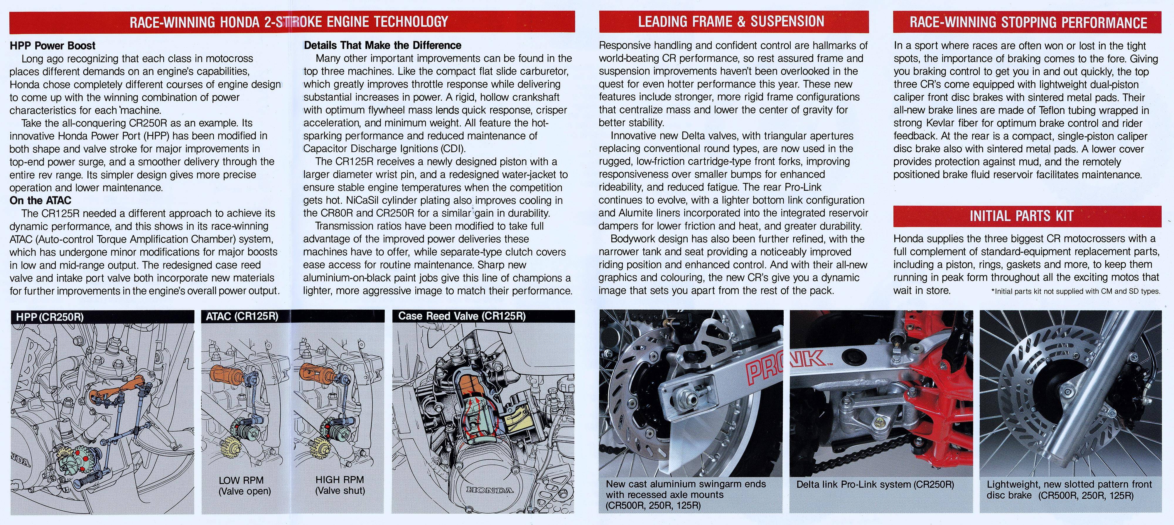 而 1994 年二月發(fā)布的 CRM250R,主要的更新內(nèi)容是新的、更有銳利感的車身造型,新設(shè)計(jì)的分體式油箱、容量從上一版本的 10 公升提高至現(xiàn)在的 11 公升,具有更高精度的 PGM - RC 排氣動(dòng)力閥門控制系統(tǒng),新的車身貼花等。