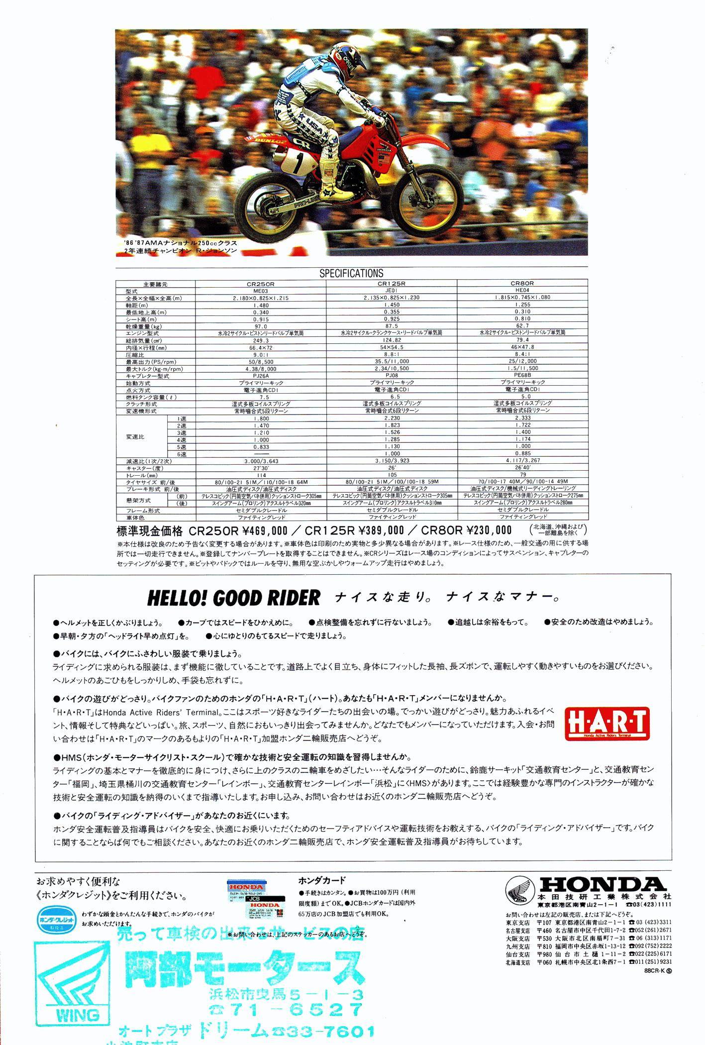 CRM250R 實際上就是基于市售越野賽車 1988 CR250R(ME03)修改而來,而 CR250R 的缸徑、行程為 66.4 mm x 72 mm,排氣量 249.3 cc,最大馬力輸出 50 匹,全車干燥重量 97 公斤。