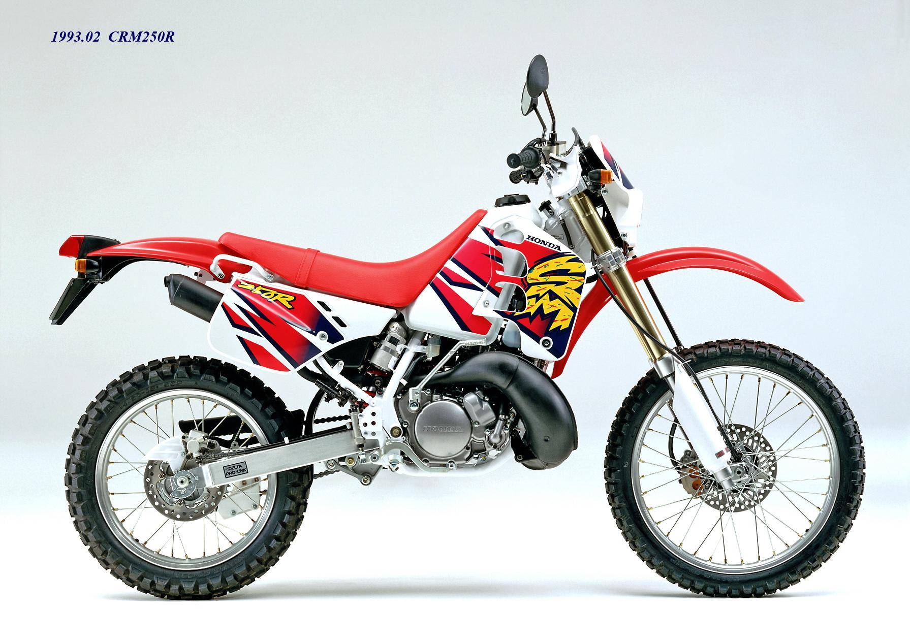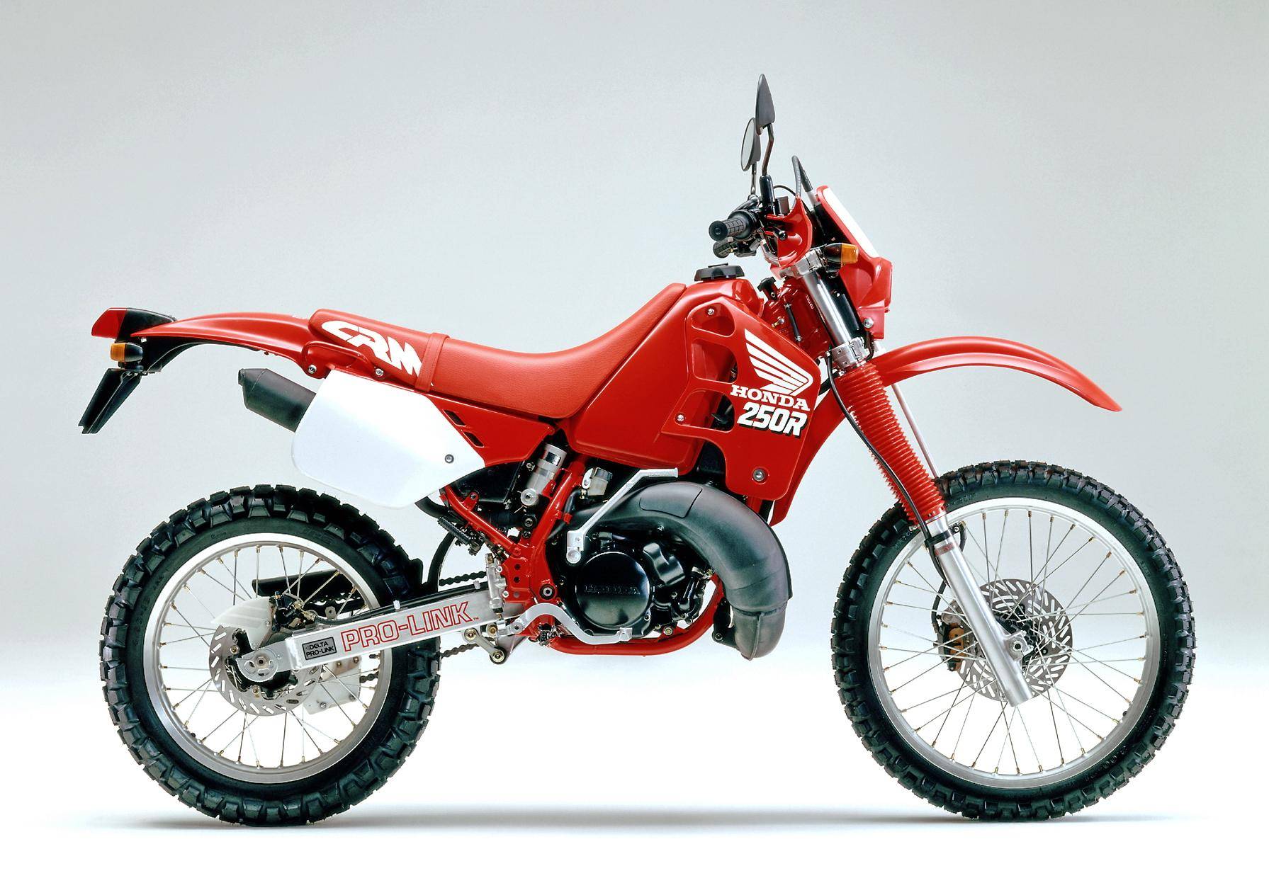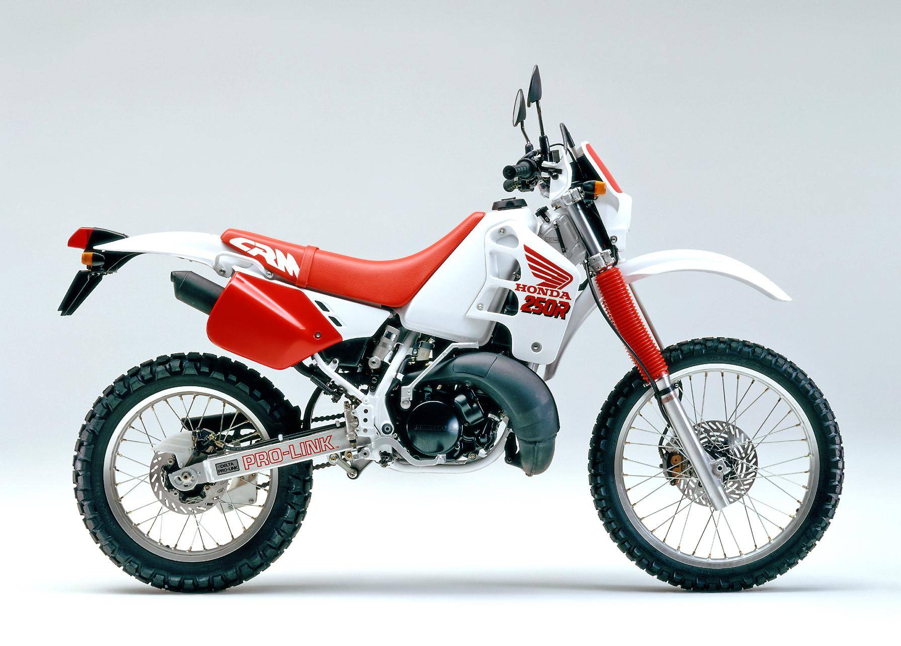 1989 年三月,Honda 正式推出全新的 On-Road 越野車 CRM250R(工廠編號 MD24)。這是廠方第一款搭載兩沖程 250 cc 級別發(fā)動機的可上牌車型,主要面向日本本土市場。該車搭載一副工廠編號為 MD24E 的水冷兩沖程單氣缸,缸徑、行程為 66 mm x 72 mm,排氣量 246 cc,節(jié)氣閥口徑為 32 mm 的化油器,能夠根據(jù)轉(zhuǎn)速去獲取最佳點火特性的 DC-CDI 點火系統(tǒng)、可變 RC 排氣動力閥門,六檔的變速齒輪箱,具有高冷卻性能的左、右分割式配置的雙散熱器,最大動力輸出 37 匹。