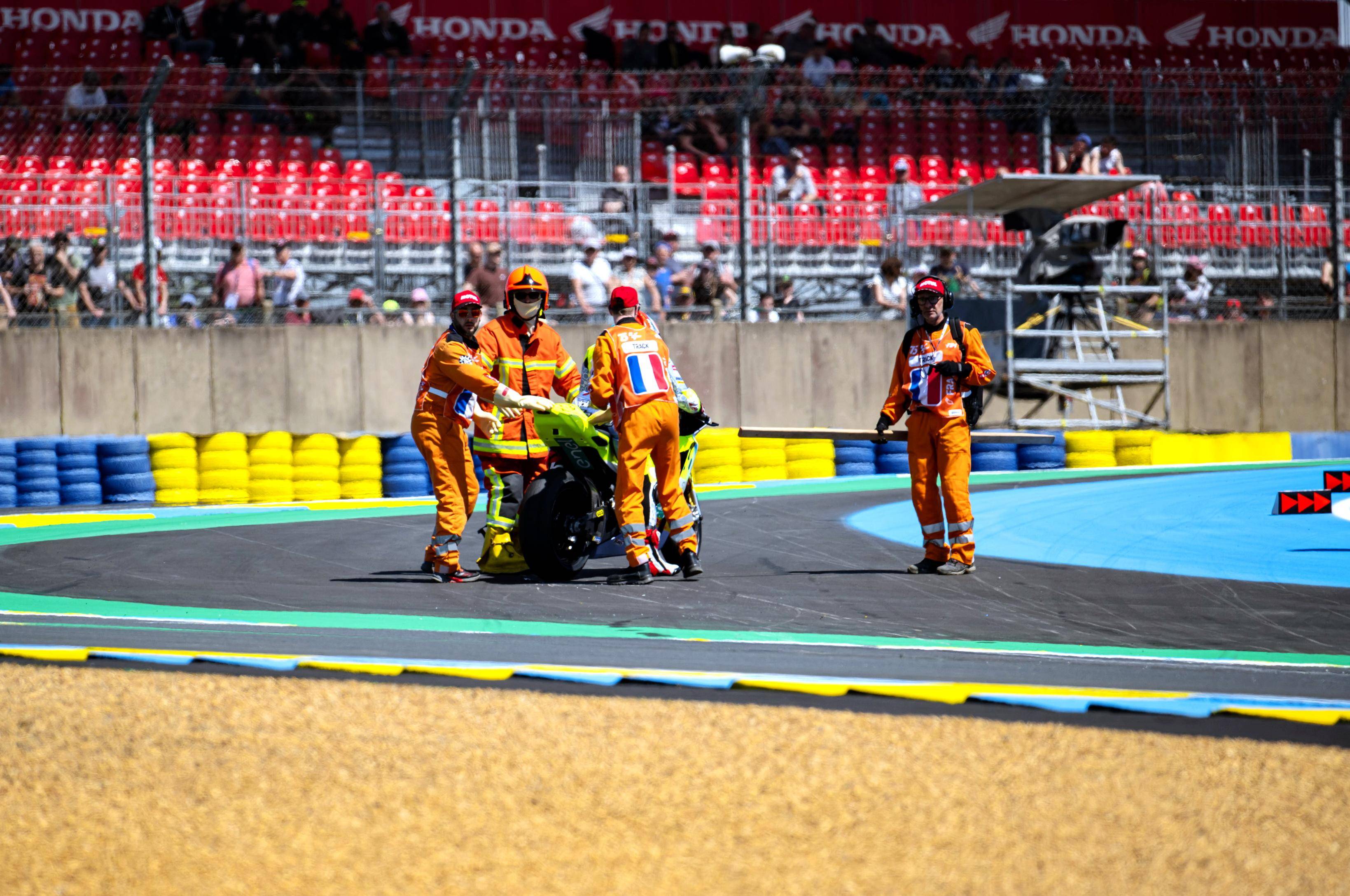昨天周五(五月 10 日),MotoE 的競賽環(huán)節(jié)是兩節(jié)練習和排位賽。早上進行的兩節(jié)練習,在車手們都開始加速的 P2,法拉利進場沒多久就發(fā)生了摔車意外、讓他被迫提前結(jié)束了這一節(jié)的練習;兩位車手在兩節(jié)練習里的綜合圈速、都沒有進入前八名,需要跑 Q1。
