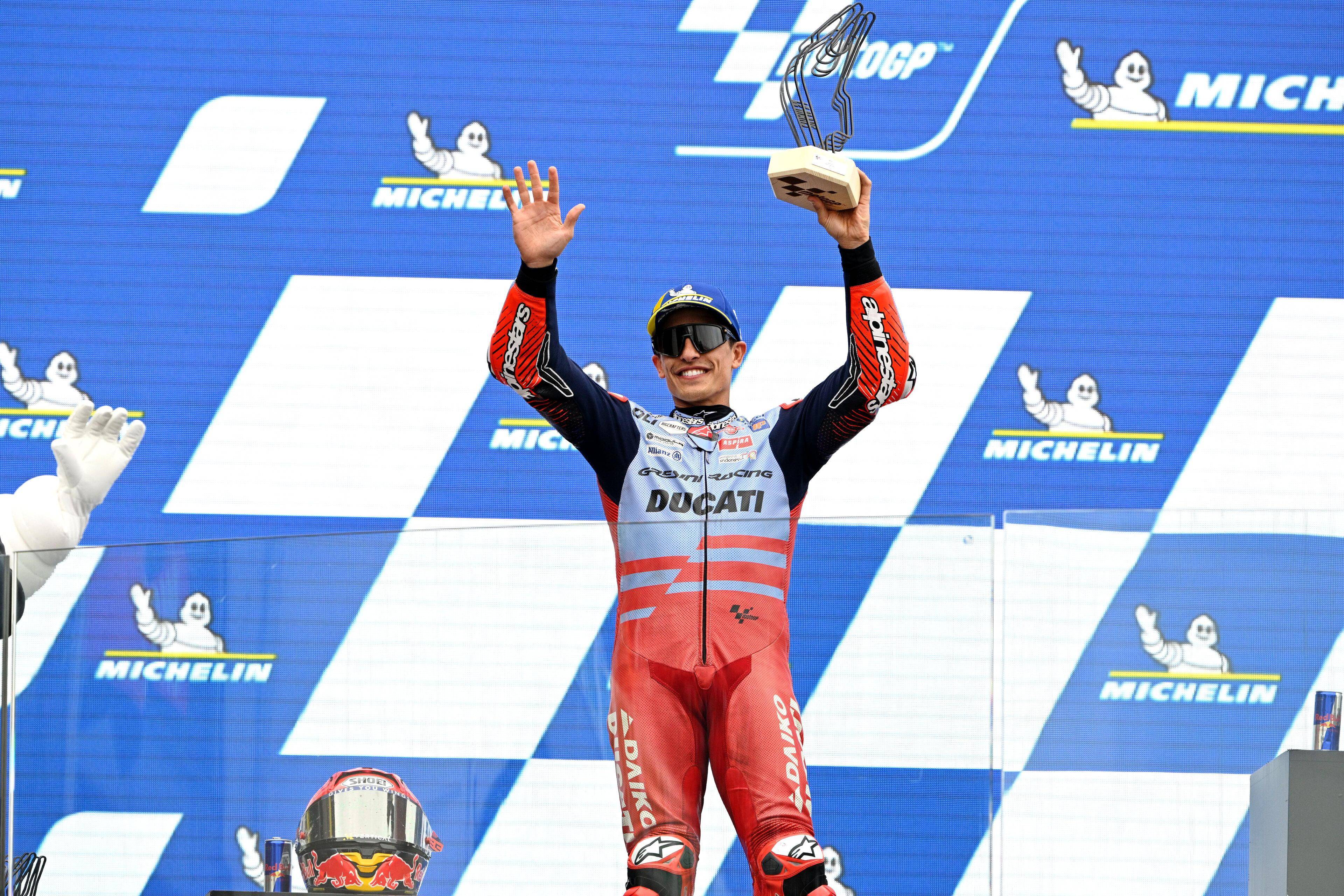 在正賽前的排位賽,吉斯尼 MotoGP 車隊(duì)的兩位車并不顯眼:馬昆斯排在第十三位起步、弟弟則排從第六排(第十七位)發(fā)車。而周末舉行的 Sprint 沖刺賽,馬昆斯一舉拿下亞軍,小馬昆斯則獲得了第十四名。