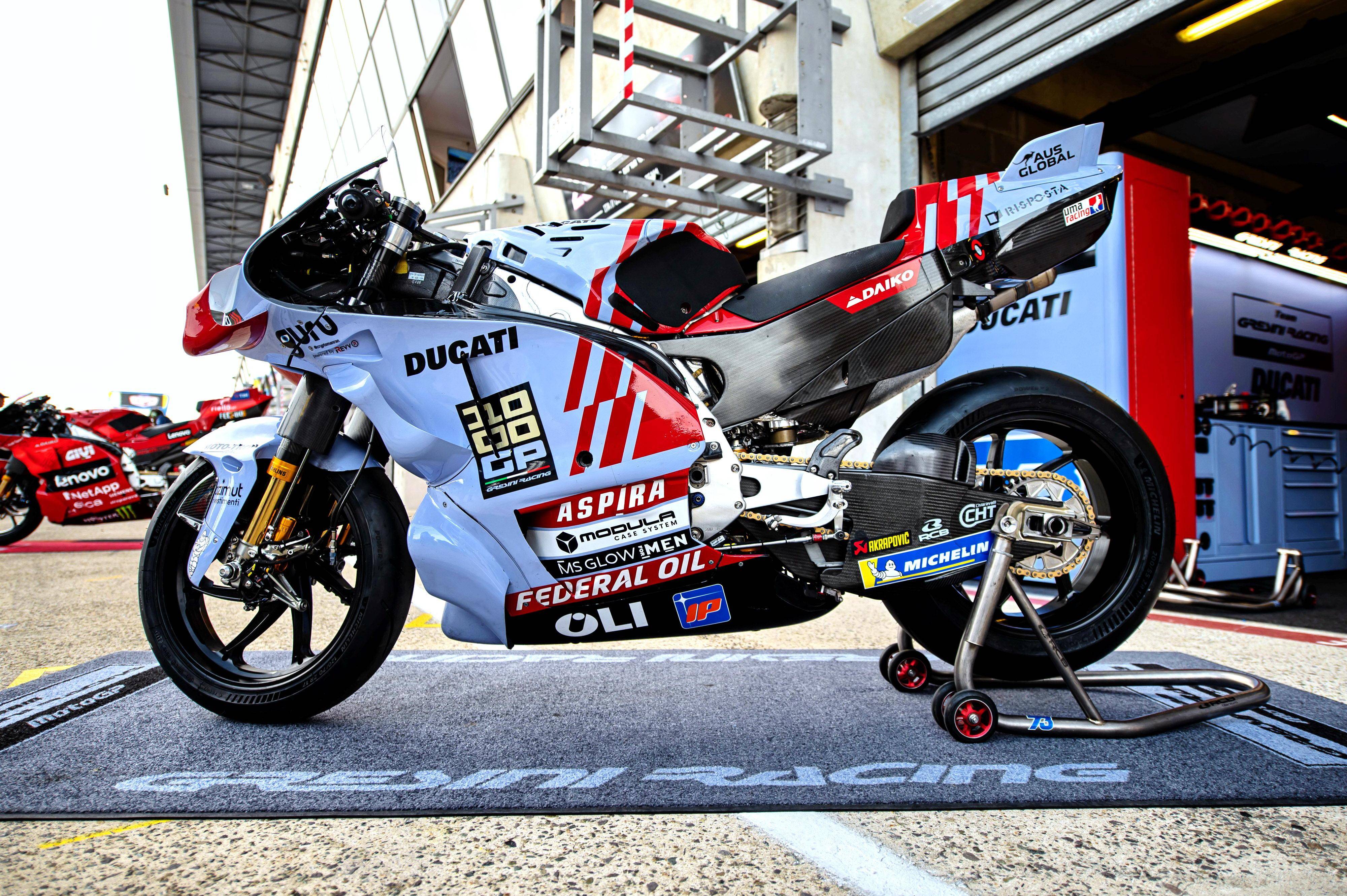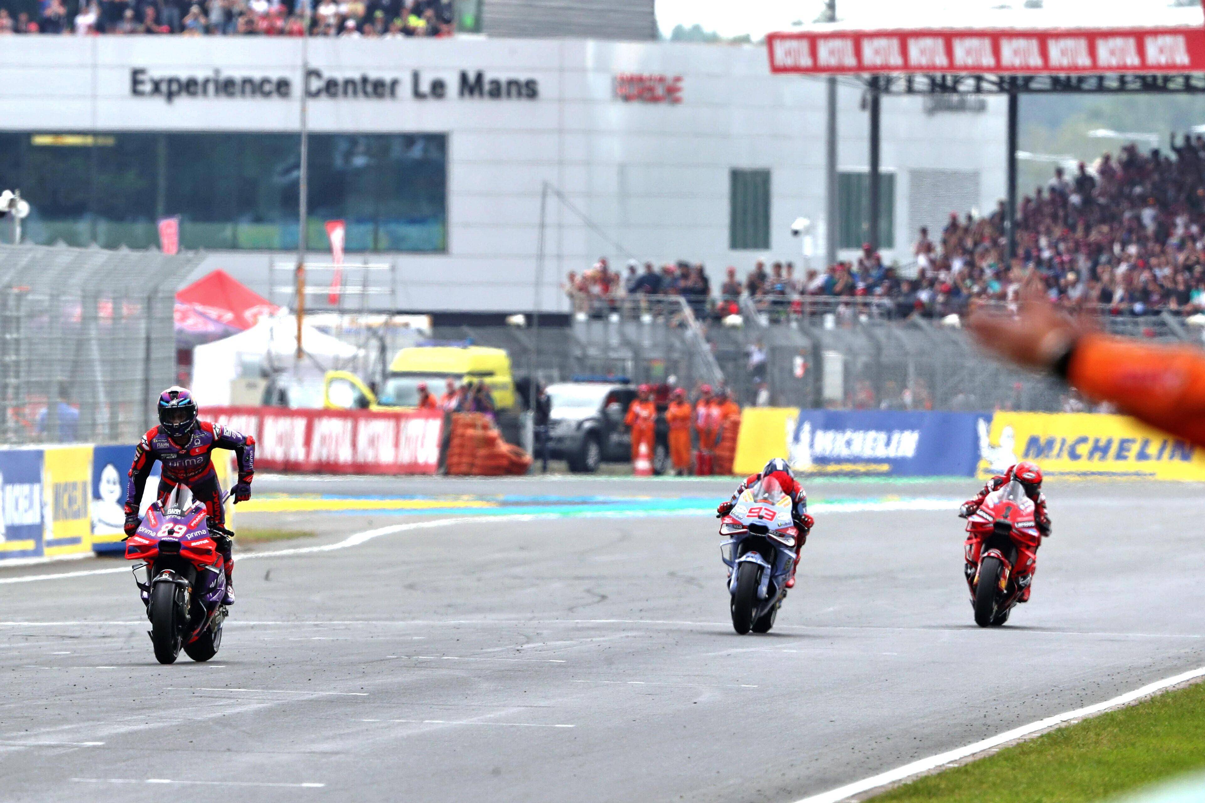 這次法國(guó)站的比賽是吉斯尼車隊(duì)在 1997 年創(chuàng)立以來(lái)、在 WGP 里面的第一千場(chǎng)(包含各個(gè)組別)比賽,車隊(duì)的兩臺(tái) Desmosedici GP23 賽車,都貼上了紀(jì)念標(biāo)志出賽。