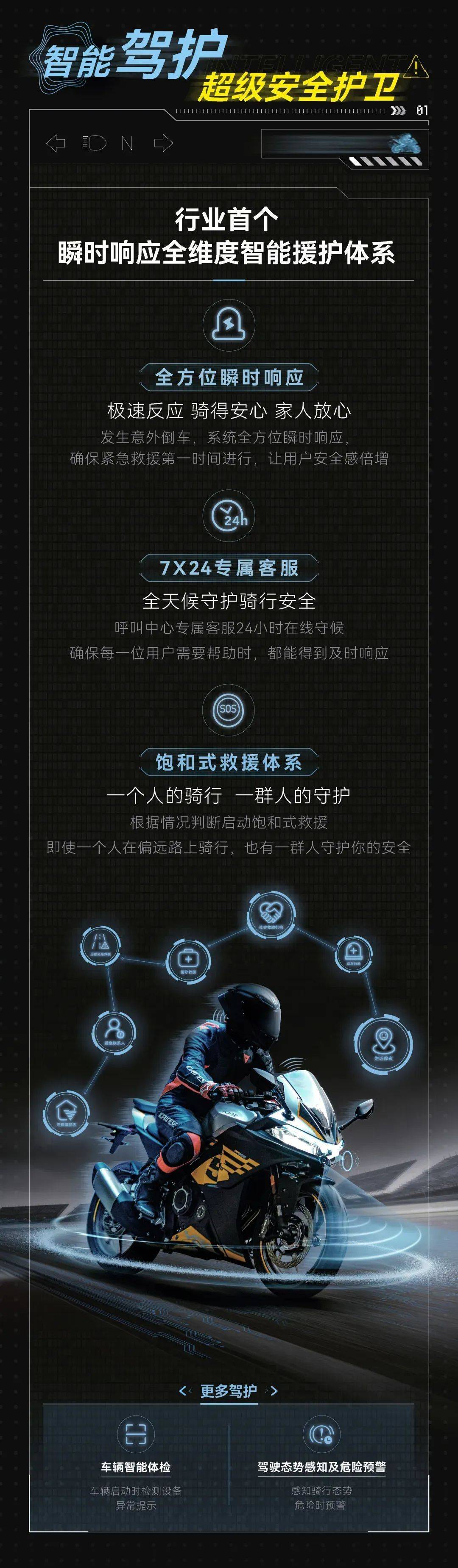 儲(chǔ)物空間巨大可以同時(shí)放一頂不帶尾翼的全盔,一頂四分之三盔,儲(chǔ)物空間在諸多250踏板中也是名列前茅。免費(fèi)安全守護(hù)、道路救援無(wú)極目前大多數(shù)車都標(biāo)配了極嶼OS系統(tǒng),該系統(tǒng)具有24小時(shí)安全守護(hù)功能,意外摔車時(shí),就會(huì)觸發(fā)后臺(tái)系統(tǒng)報(bào)警,值班客服小姐姐就會(huì)打來(lái)電話詢問(wèn)車主安全狀況,可以協(xié)助車主報(bào)警、呼叫救護(hù)或道路救援等,而這些救助都是免費(fèi)的哦。續(xù)航有優(yōu)勢(shì)此外,SR250GT還有一定的續(xù)航優(yōu)勢(shì),其日常百公里油耗在3.2-3.8左右,14升油箱,可以帶來(lái)約400公里的最大續(xù)航,在250踏板中也算良好水平。