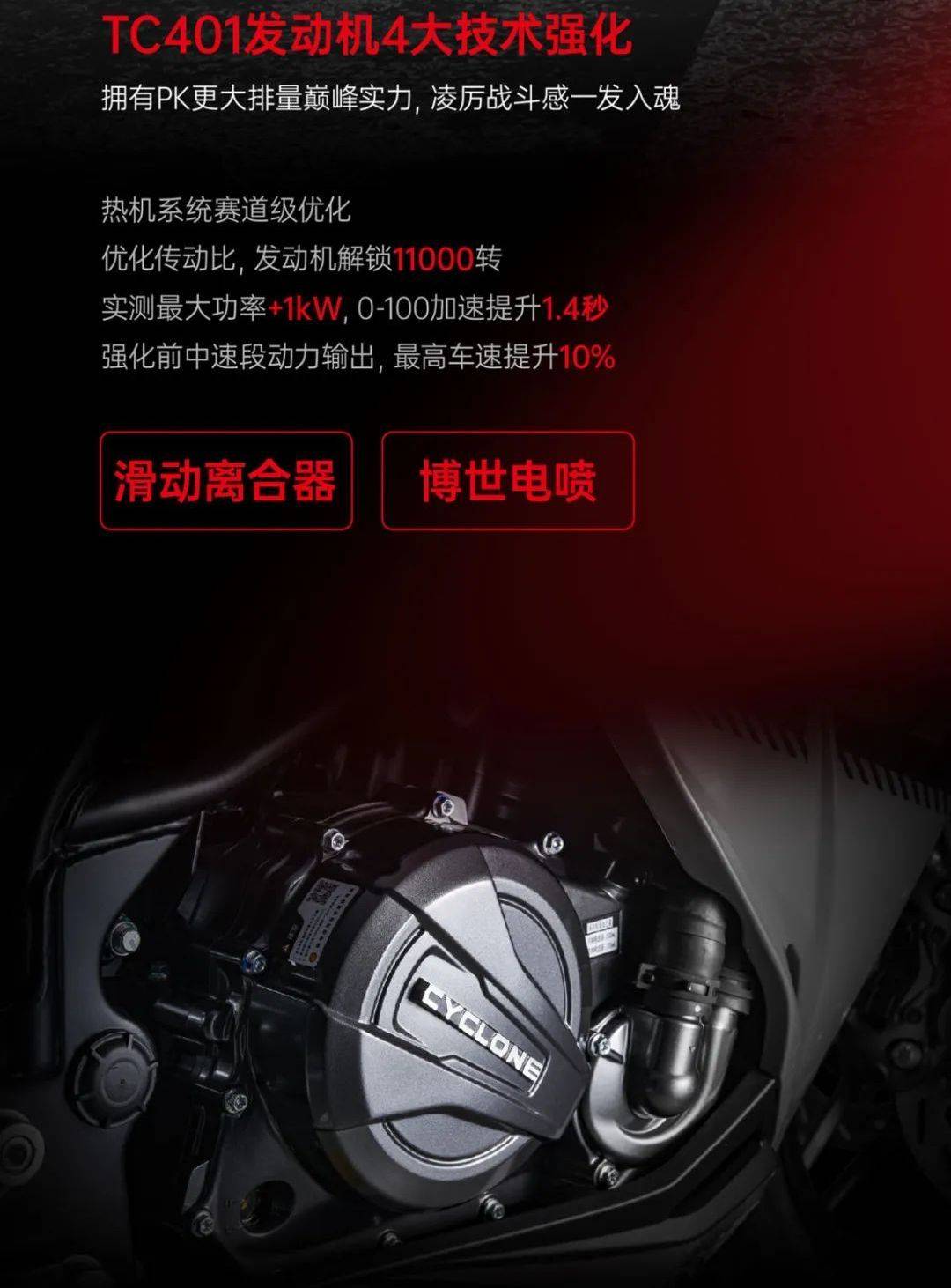 日前,賽科龍發(fā)布了24款的RC401,運(yùn)動(dòng)版和賽道版售價(jià)分別再次下探1000元,21988元起,性價(jià)比進(jìn)一步提升,最重要的是RC401的動(dòng)力顯著提升了。賽科龍那款已經(jīng)上市數(shù)年,相當(dāng)成熟的TC401發(fā)動(dòng)機(jī),再度進(jìn)步,通過(guò)熱機(jī)系統(tǒng)優(yōu)化、傳動(dòng)優(yōu)化,最高轉(zhuǎn)速?gòu)闹暗?500轉(zhuǎn)大幅提升到11000轉(zhuǎn),最大功率也提升了1KW,來(lái)到了34Kw/11000轉(zhuǎn)。所以24款的RC401零百加速提升了1.4秒,升級(jí)之前的零百加速為5.8秒左右,如今預(yù)計(jì)可以達(dá)到4.5秒以內(nèi),這是一個(gè)非常巨大的提升,比本田CBR400R和川崎Ninja400都要快一截了,這兩款車網(wǎng)上能查到的零百成績(jī)分別為5.5秒和4.9秒。TC401是偏高轉(zhuǎn)的發(fā)動(dòng)機(jī),但之前我們?cè)谠囻{中就發(fā)現(xiàn),低轉(zhuǎn)并不會(huì)覺得無(wú)力,而是動(dòng)力輸出平順,如今升級(jí)后的TC401,再次提升了中前段動(dòng)力輸出,同時(shí)最高車速提升10%。