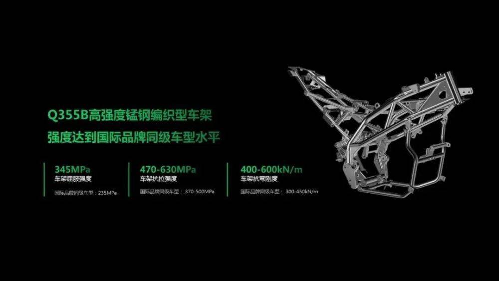 RC401的另一個(gè)優(yōu)勢(shì)是車架,采用Q355B高強(qiáng)度錳鋼編織型車架,在保證車架強(qiáng)度及剛性的前提下,也能做到不錯(cuò)的輕量化,這副車架擁有345MPa的車架屈服強(qiáng)度,470-630MPa的車架抗拉強(qiáng)度,400-600kN/m的車架抗彎剛度,均超過(guò)了國(guó)際品牌同級(jí)車型的規(guī)格。
