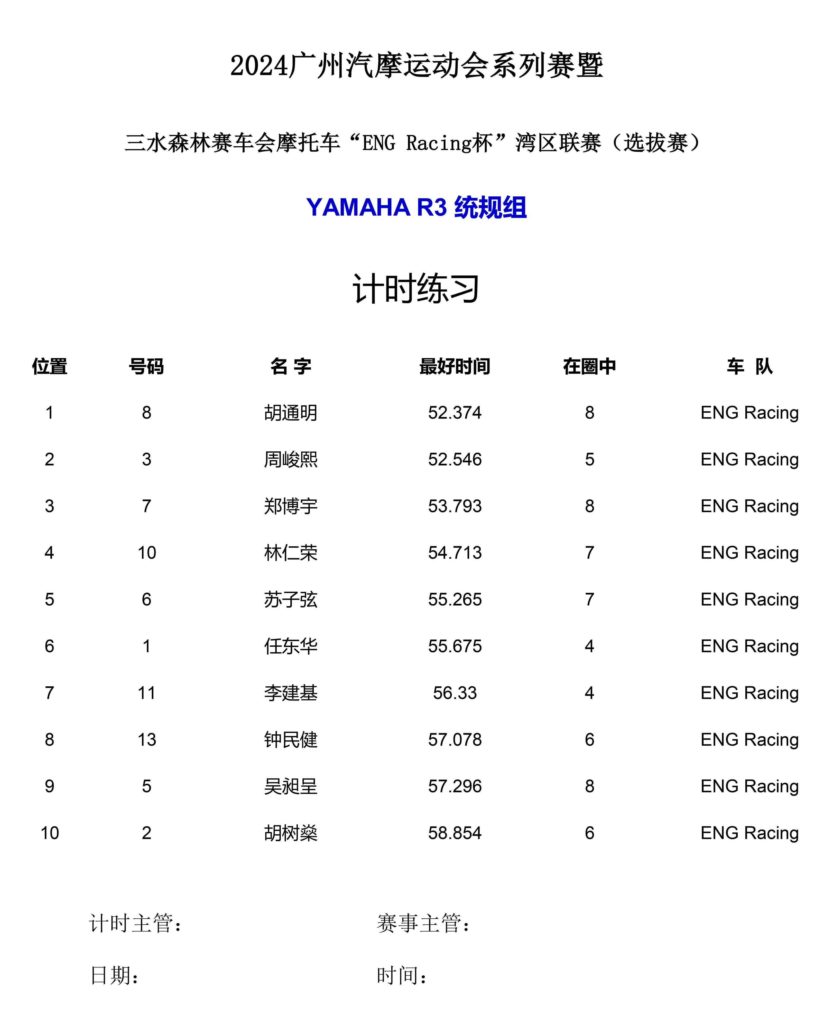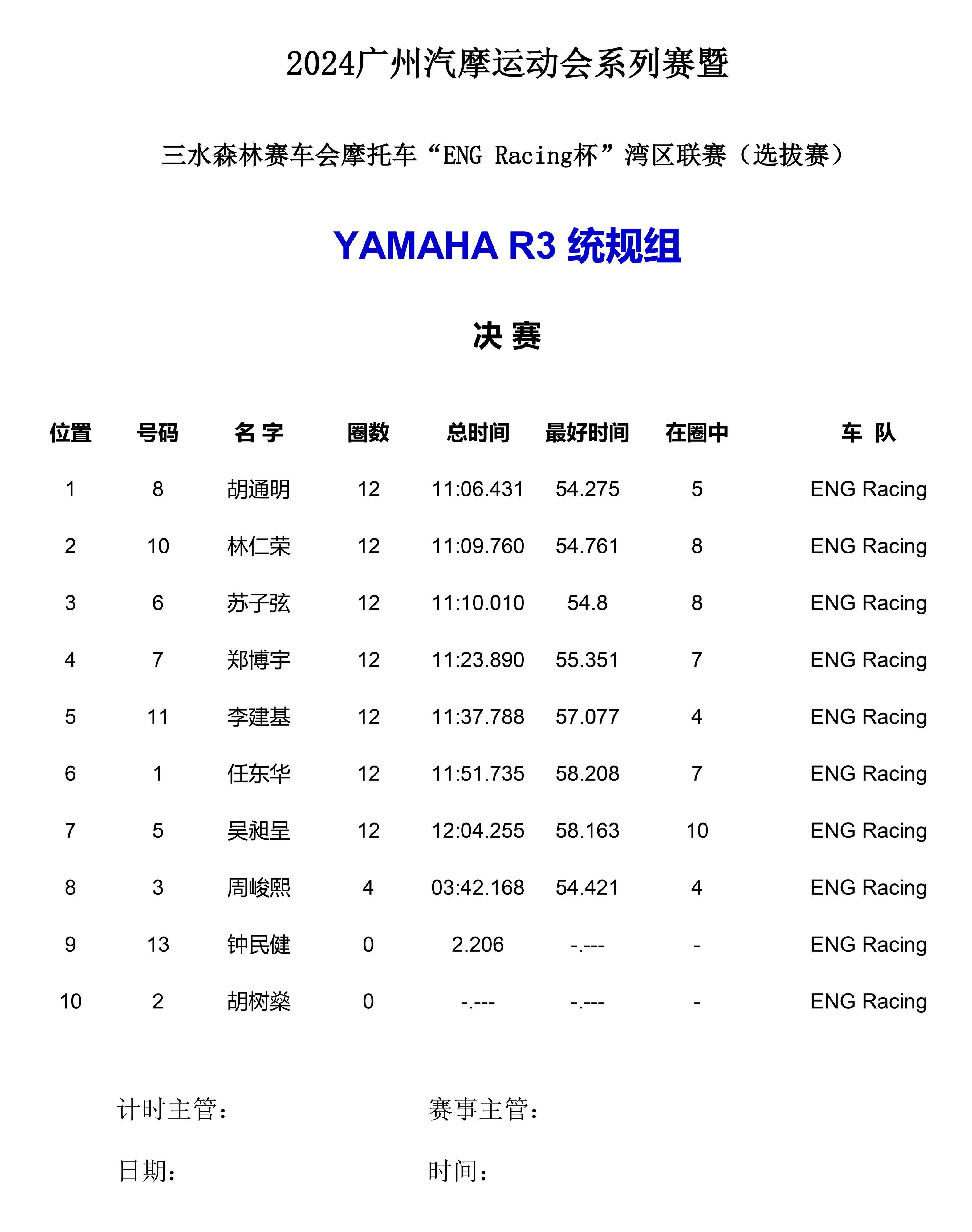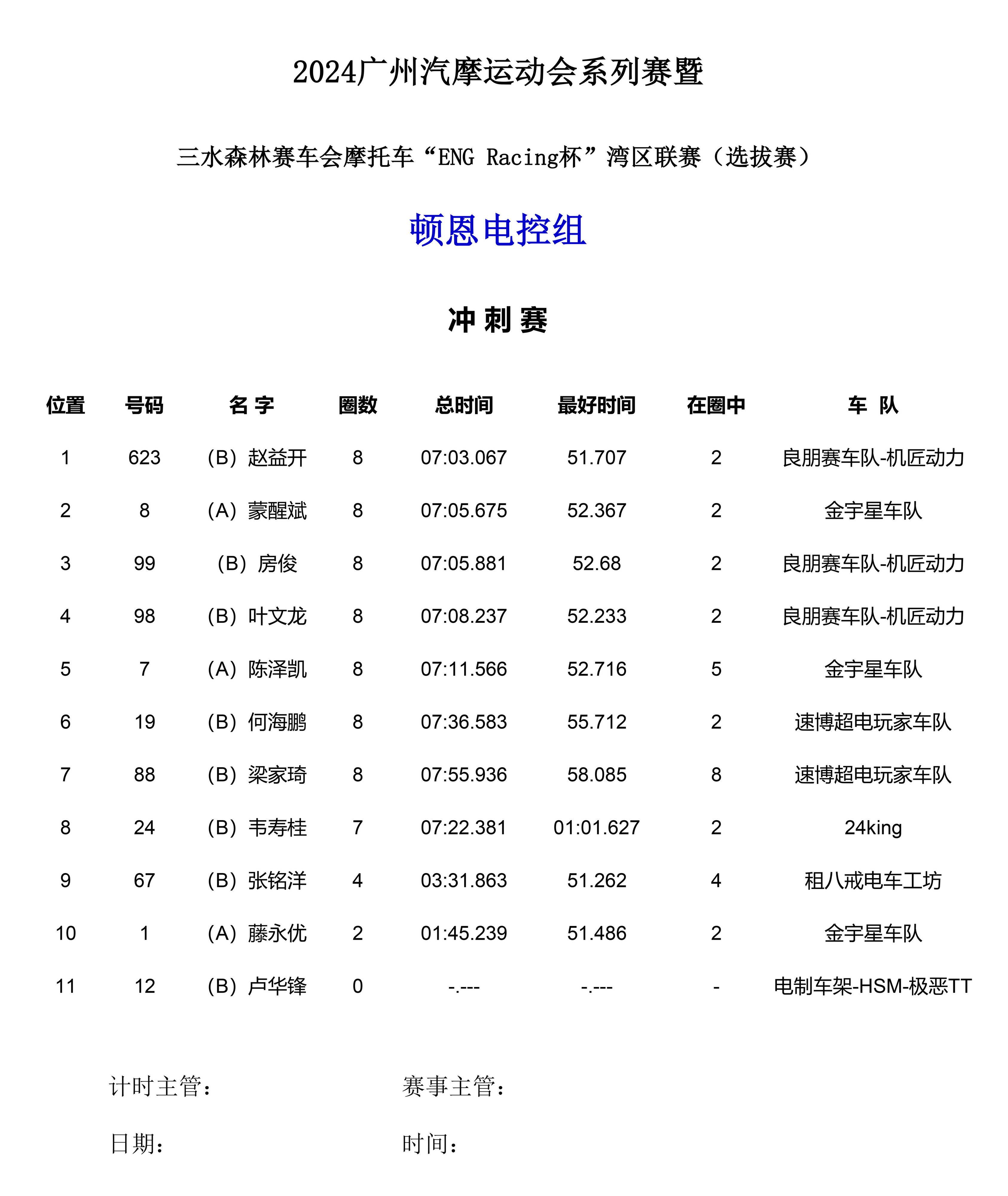 下面的圖片,2024 廣州汽摩運動協(xié)會系列賽暨三水森林賽車會摩托車 ENG Racing 杯灣區(qū)聯(lián)賽第一回合、各競賽組別成績: