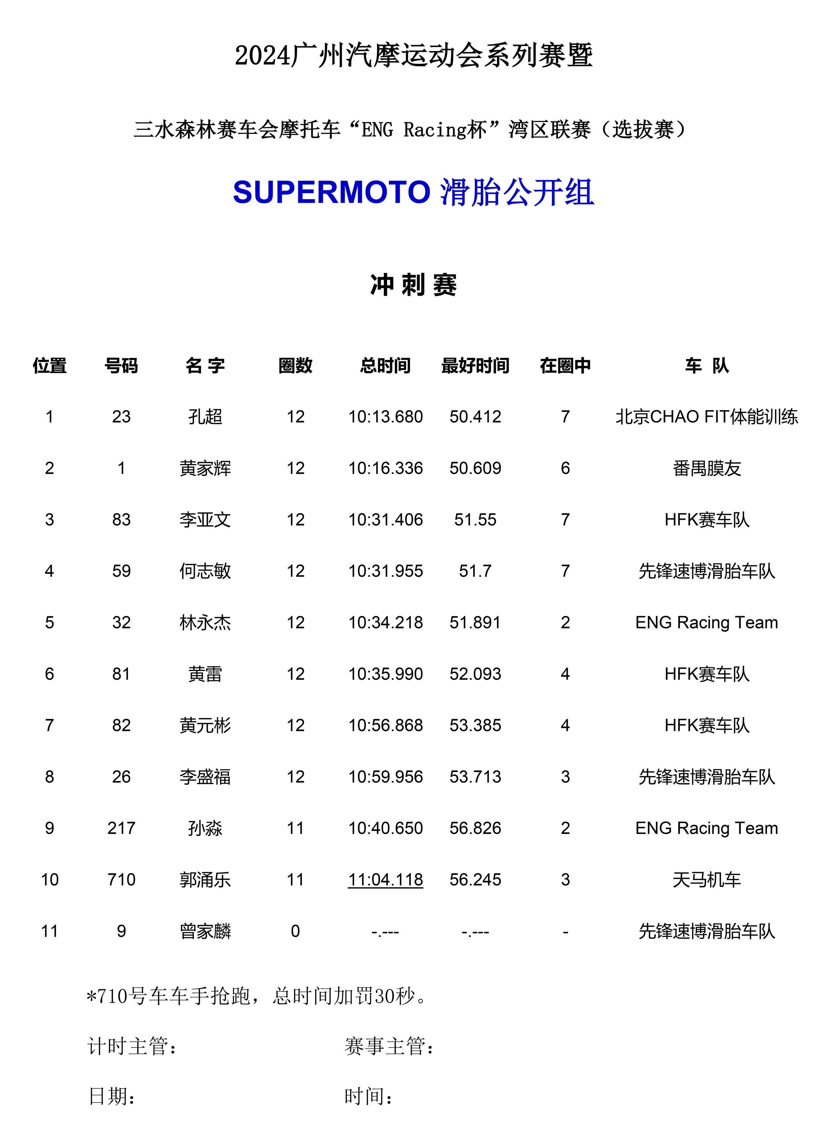3、Supermoto 滑胎公開組,參賽車手十一人,在各個競賽環(huán)節(jié)中跑出來的最佳圈速是 50.412 秒(孔超);