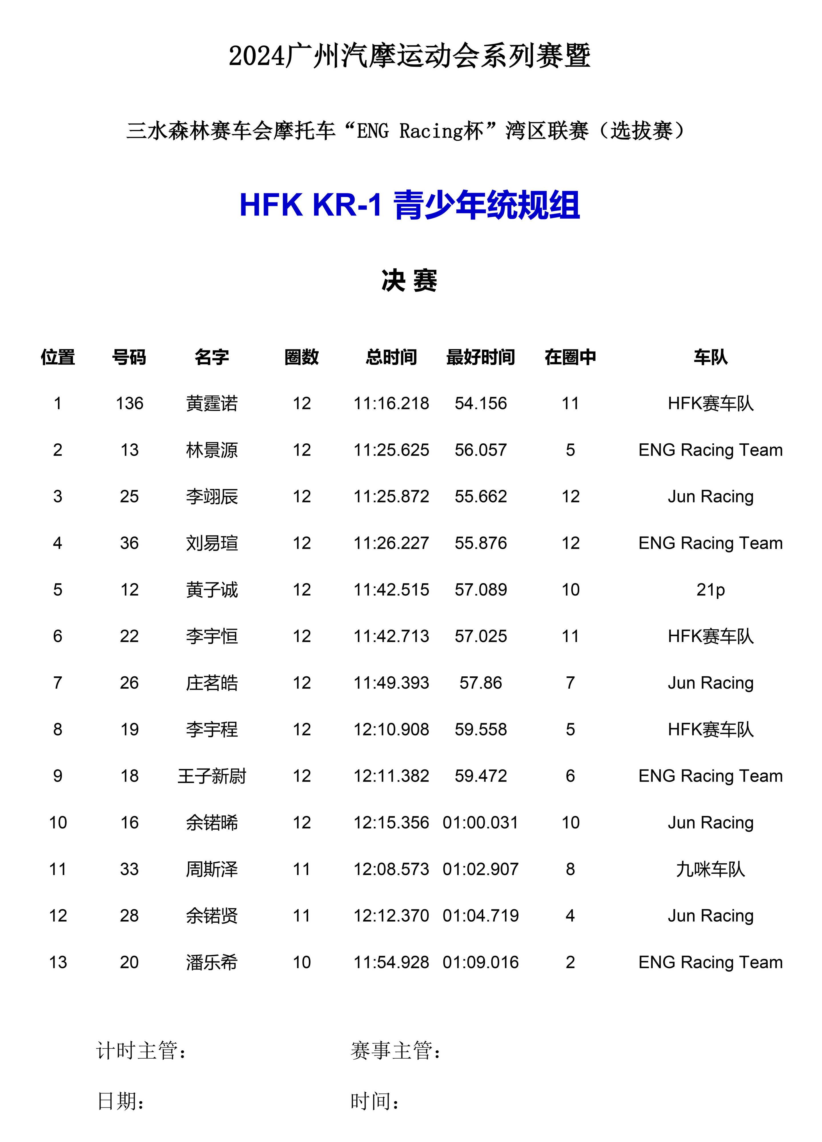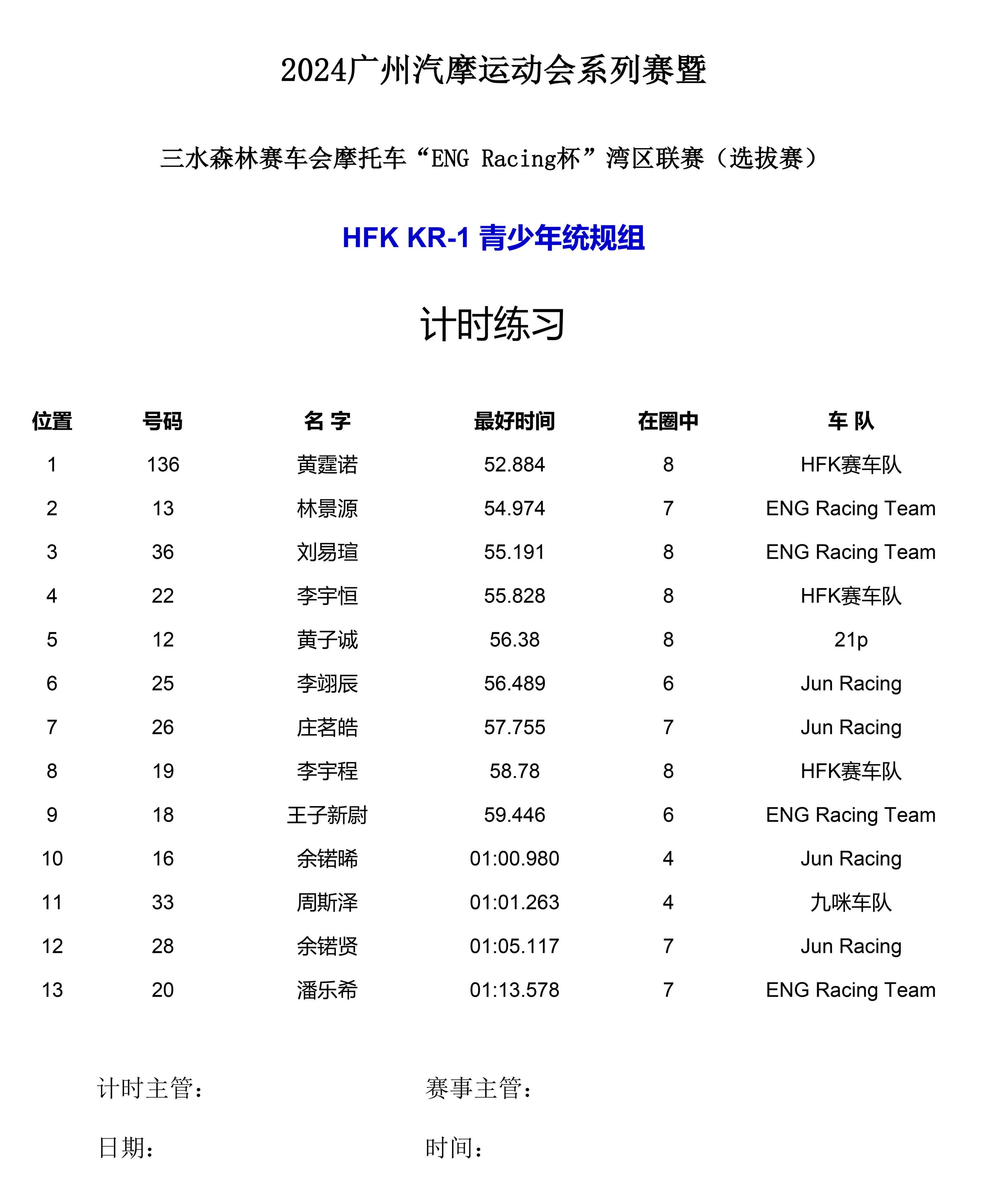 1、HFK KR-1 青少年統(tǒng)規(guī)組(KR-1 青少年精英 160 cc 統(tǒng)規(guī)組),參賽車手十三人,在各個競賽環(huán)節(jié)中跑出來的最佳圈速是 52.884 秒(黃霆諾);