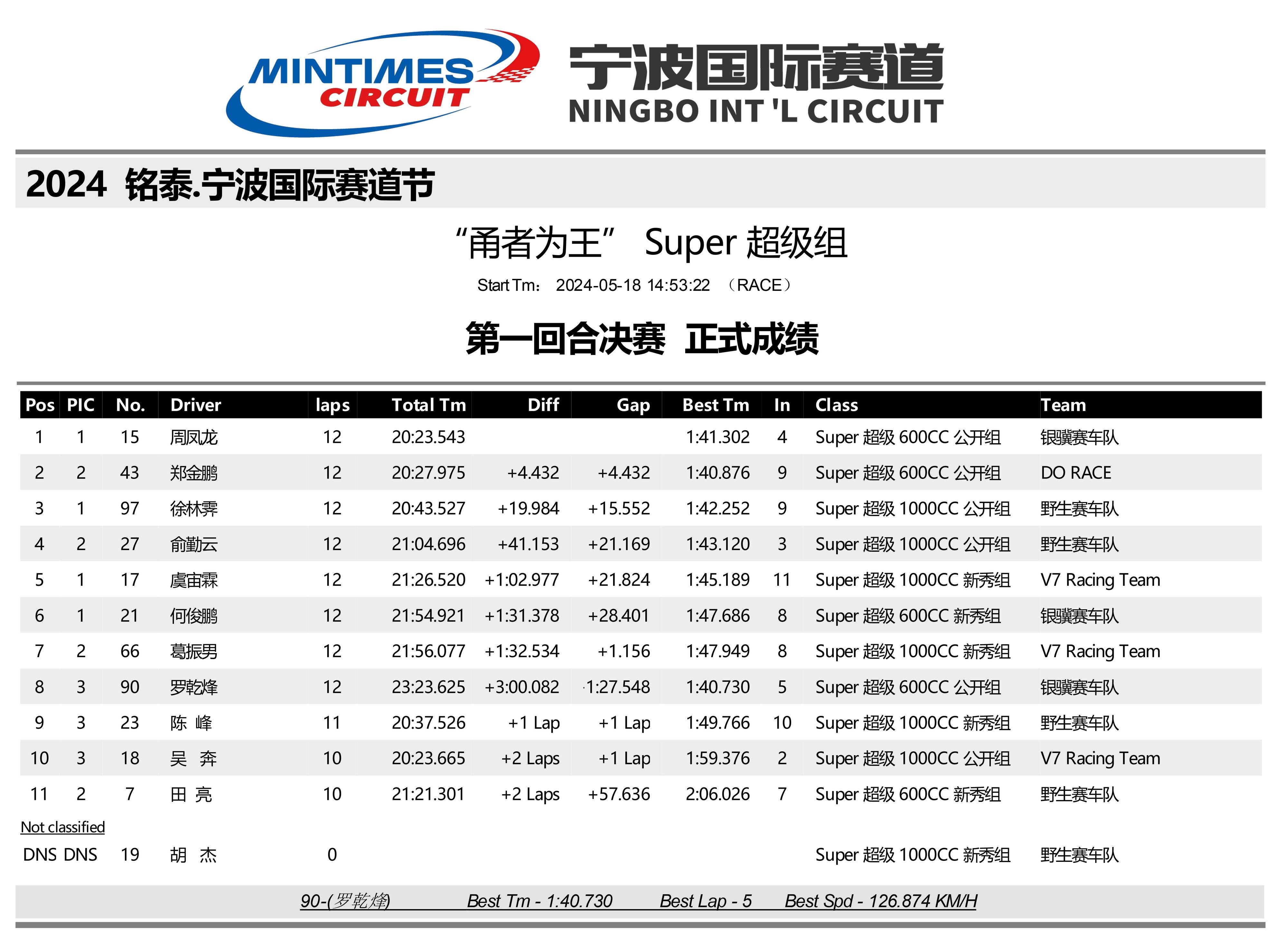 五月 18 日、周末,2024 “ 甬者為王 ” 超級摩托車嘉年華、各組別第一回合比賽的前列名次如下: