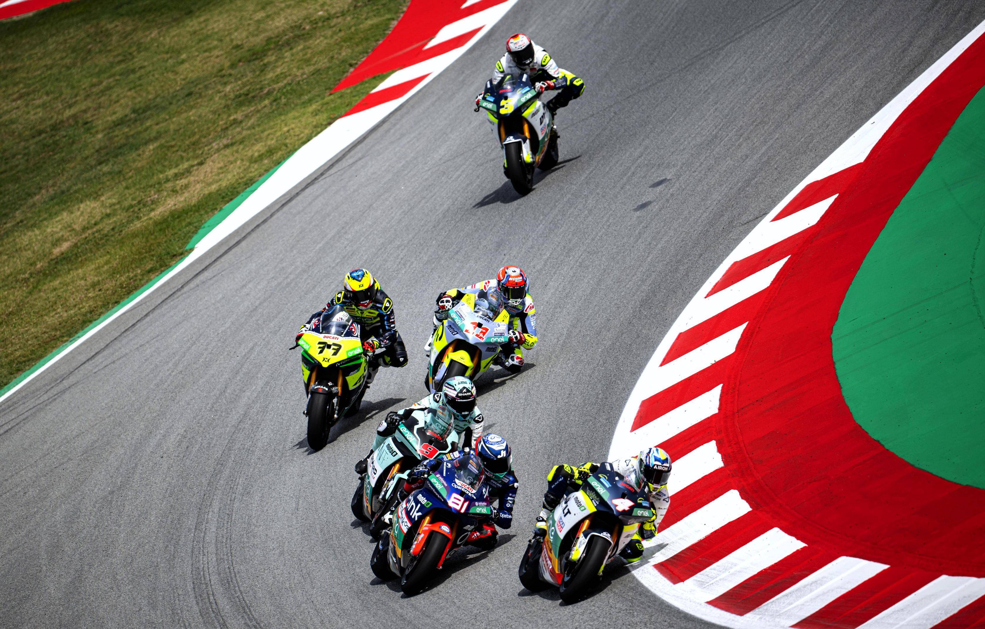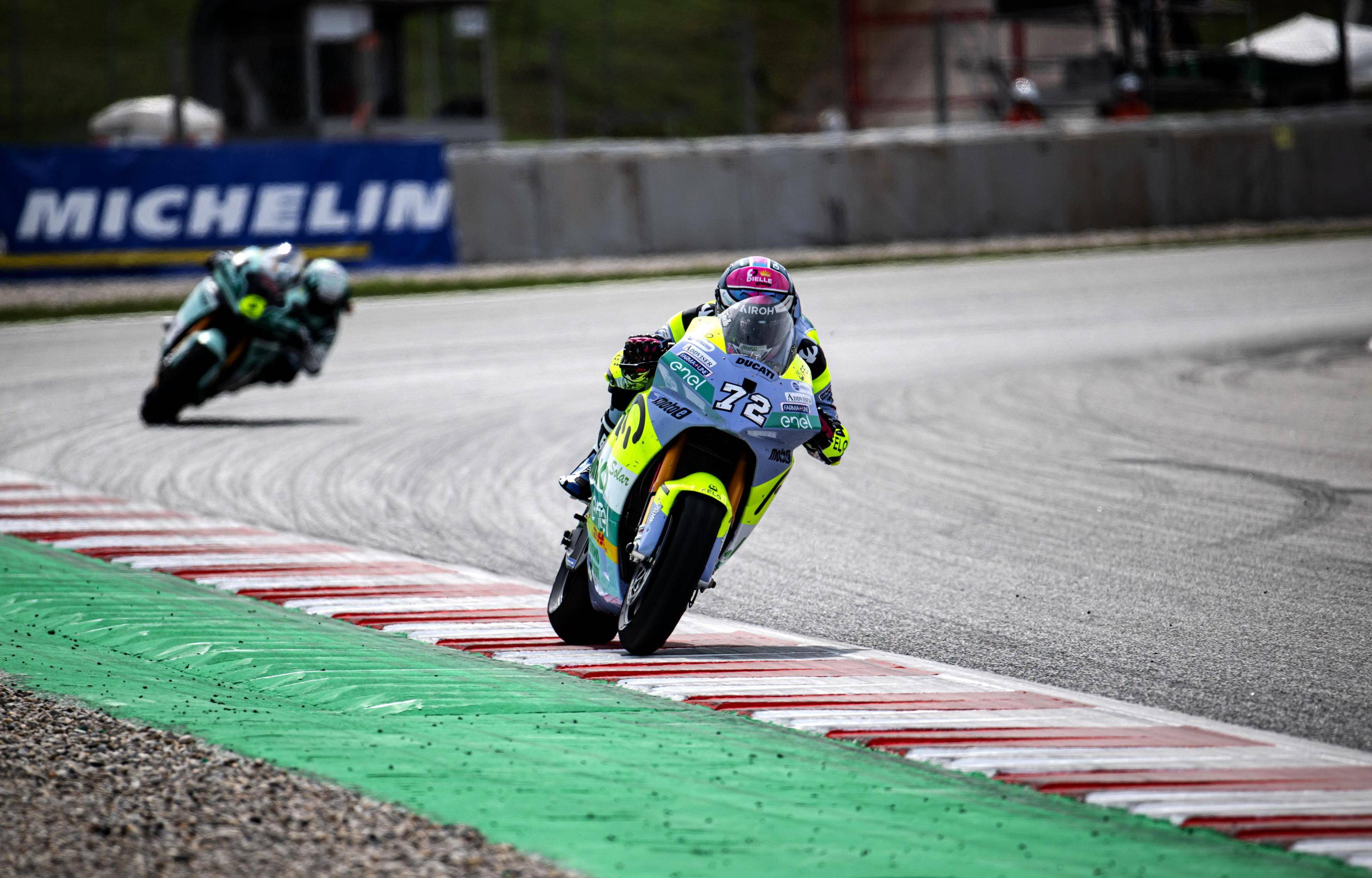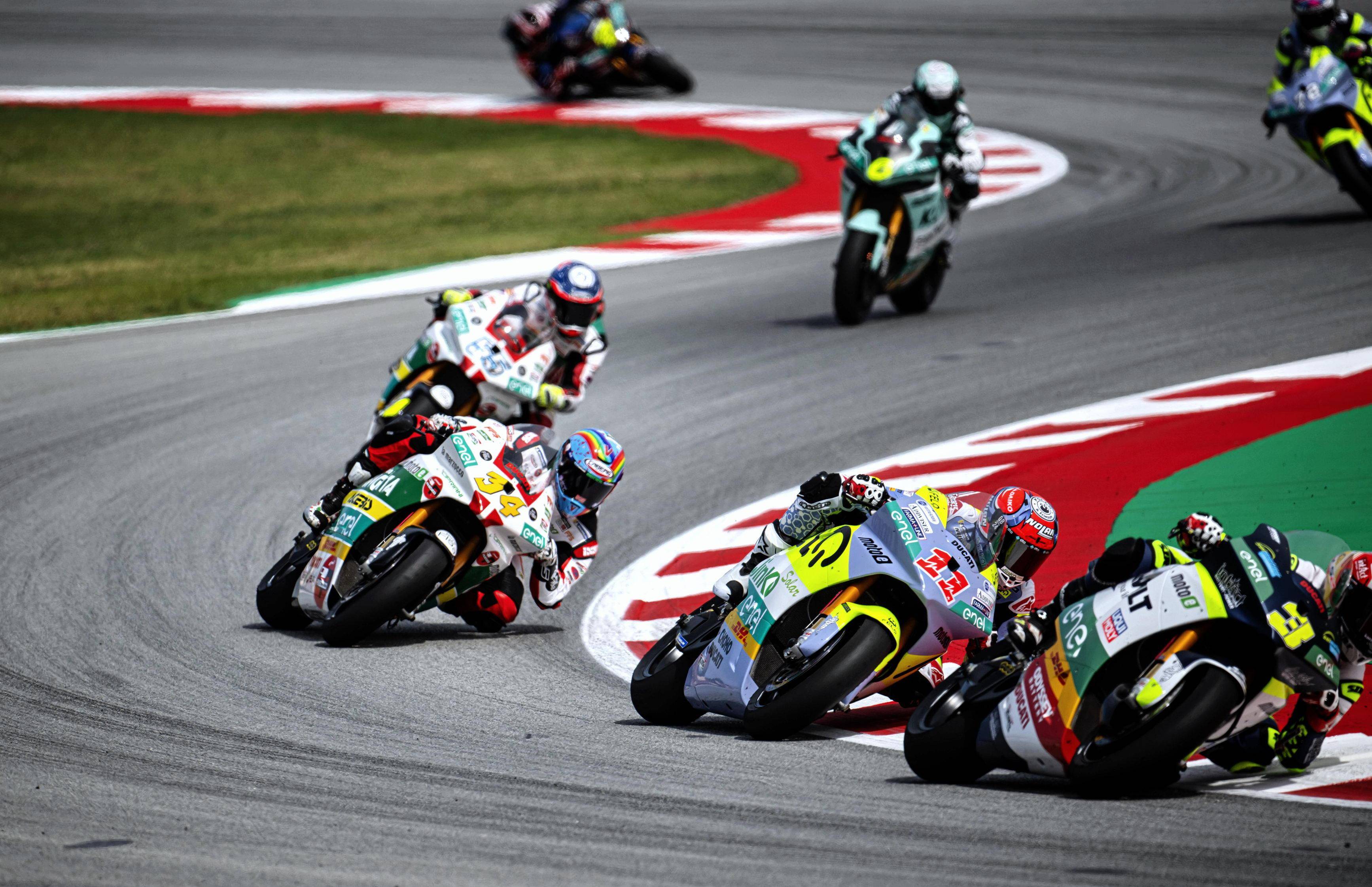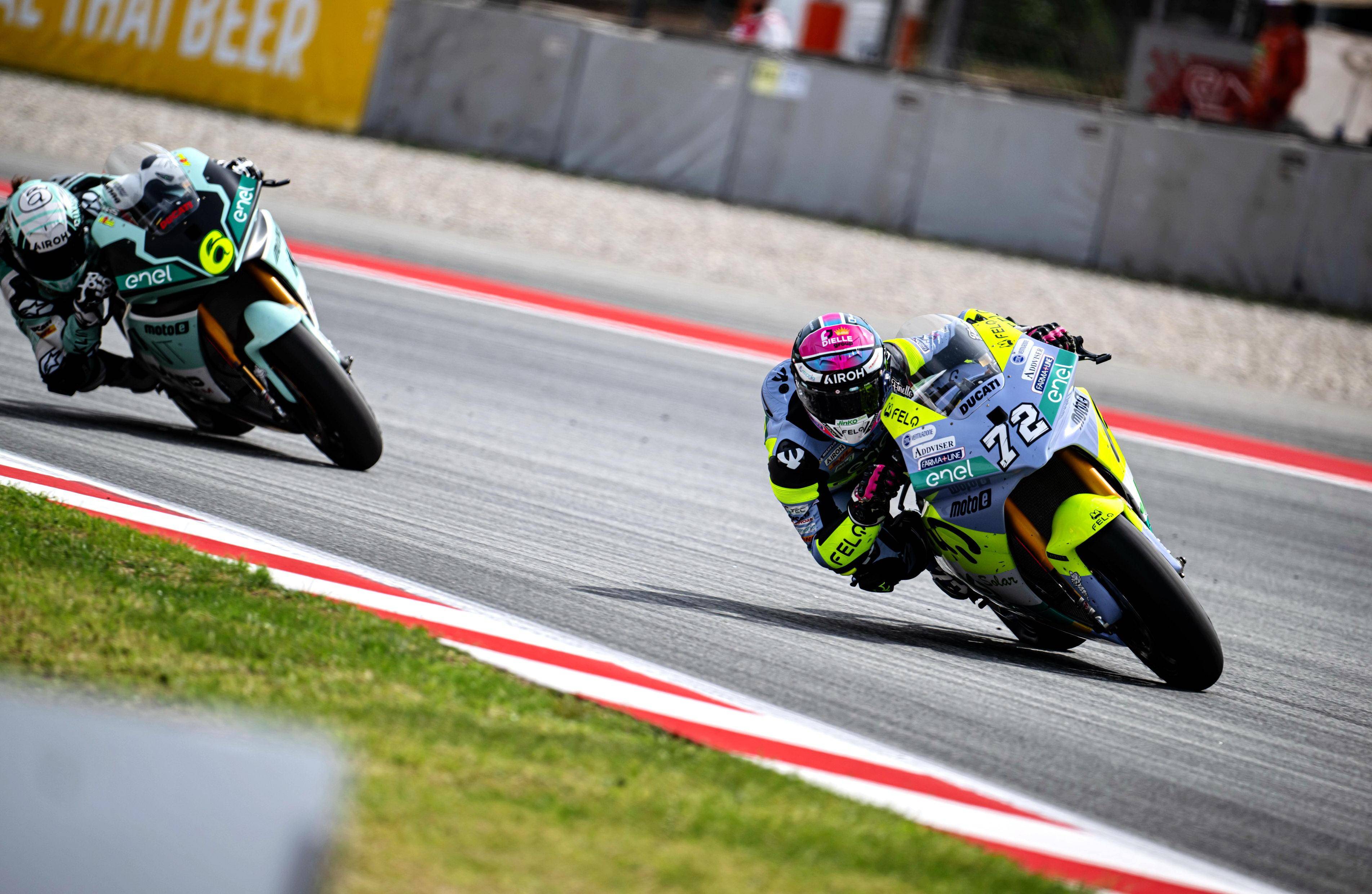 昨天周末(五月 25 日),MotoE 加泰羅尼亞站進(jìn)行了兩節(jié)的正式比賽,每節(jié)比賽的賽程為 7 圈、折合約 32.6 公里。中午進(jìn)行的第一節(jié)比賽,起跑后法拉利就與另外的四、五名對(duì)手糾纏在一起,在跑道上展開(kāi)追逐;而費(fèi)內(nèi)洛的發(fā)車并不順利,完成了第 1 圈比賽回來(lái)、位置掉到了第十五。最終,法拉利奪得了第八,全力追趕的費(fèi)內(nèi)洛最后拿到了第十二名。