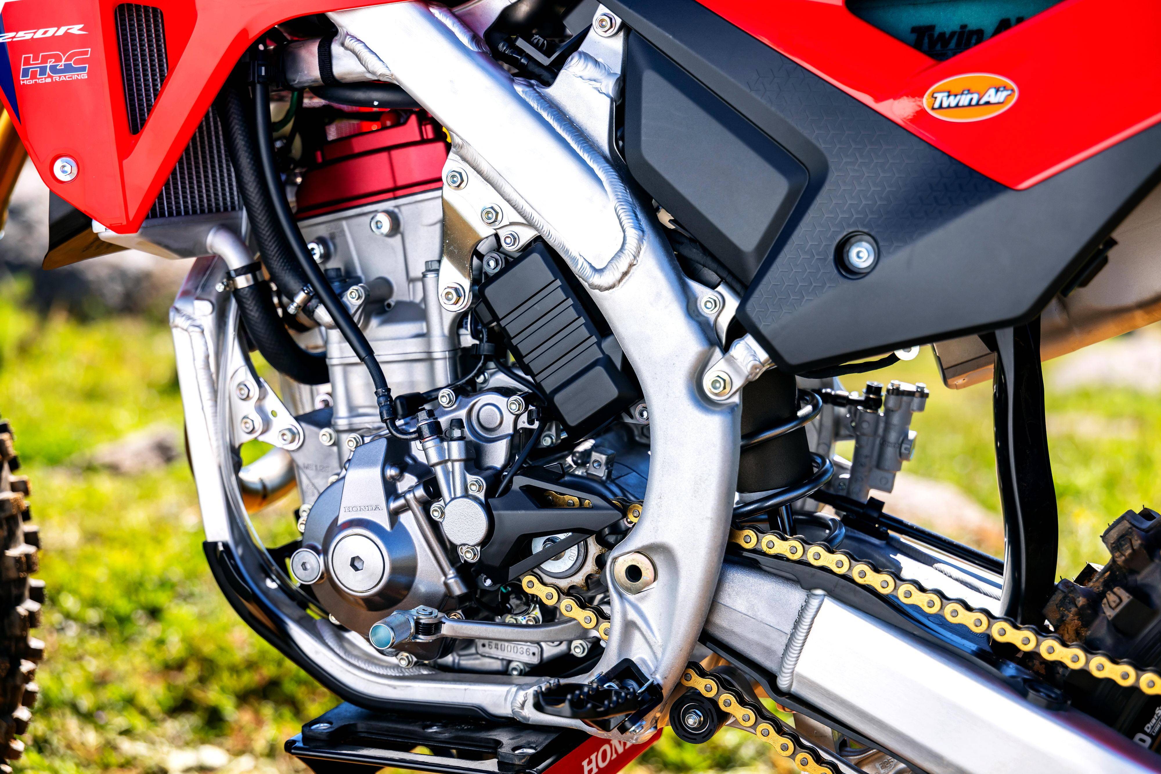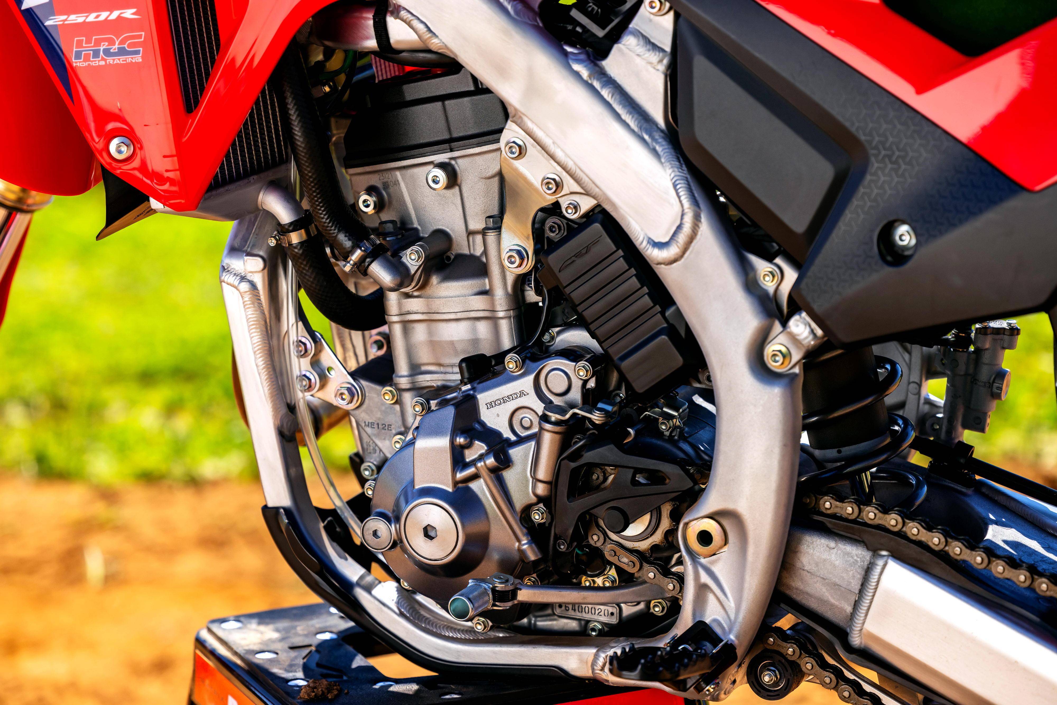 新一代的 2025 CRF250R 搭載一副水冷四沖程單氣缸、DOHC 四氣閥的發(fā)動(dòng)機(jī),缸徑、行程維持了與現(xiàn)行 2024 款相同的 79 mm x 50.9 mm,為降低摩擦的氣缸偏移 4.5 mm 的設(shè)計(jì)獲得了沿用,13.9:1 的壓縮比,排氣量 249.4 cc,配備了 PGM-FI 電子燃油噴注系統(tǒng),五檔的變速齒輪箱。廠方?jīng)]有公布新車的峰值馬力輸出,但這類車型的數(shù)字普遍在 45 匹以上。