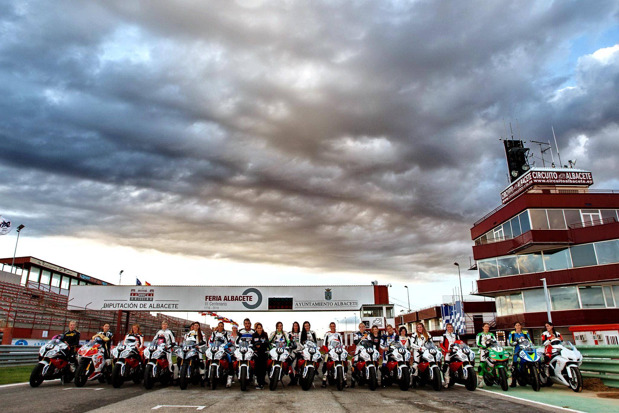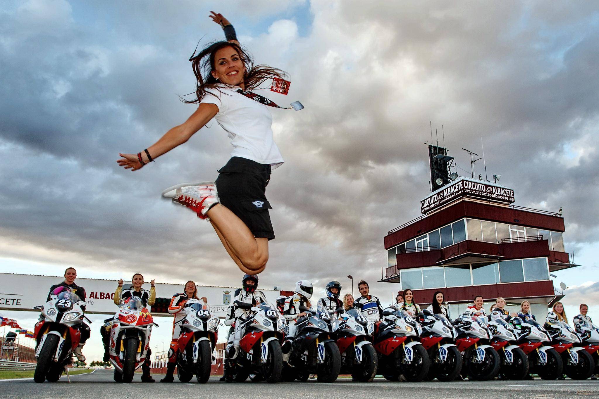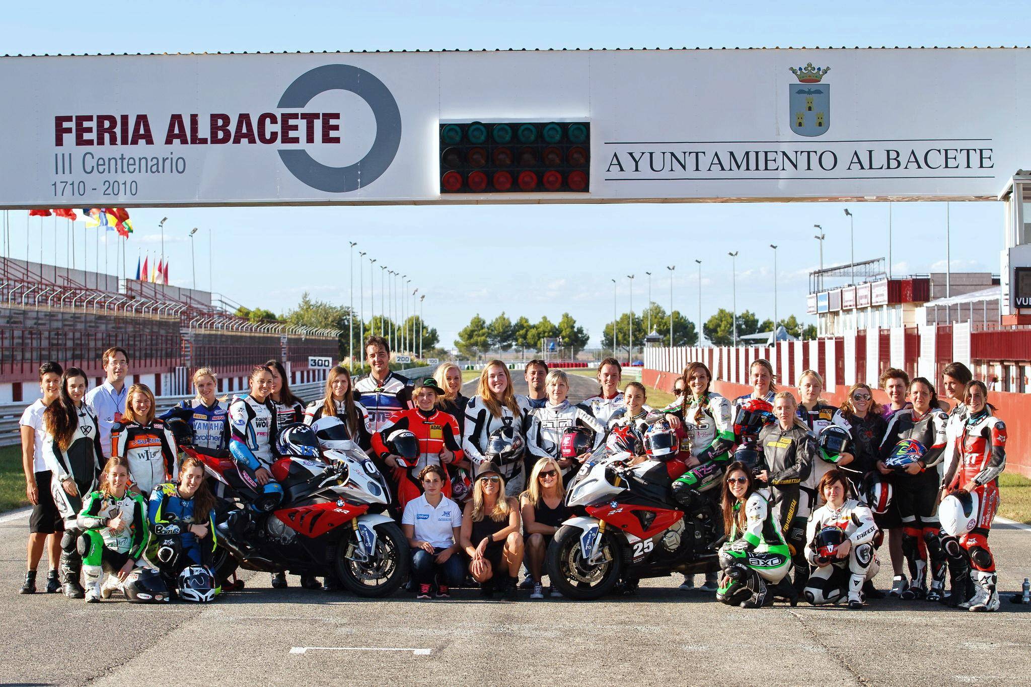 下面的圖片,2013 年、FIM 在西班牙的阿爾巴塞特(Albacete)賽車場(chǎng),舉辦了首屆女子公路賽車訓(xùn)練營(yíng)(FIM Women Road Racing Camp)。當(dāng)時(shí)的主教練是來自德國(guó)的前 WGP250 級(jí)別車手龐斯根(Katja Poensgen)—— 她是全球迄今為止,唯一一位能夠在 WGP 世界錦標(biāo)賽中量級(jí)別(WGP250)里面獲得積分的女車手。